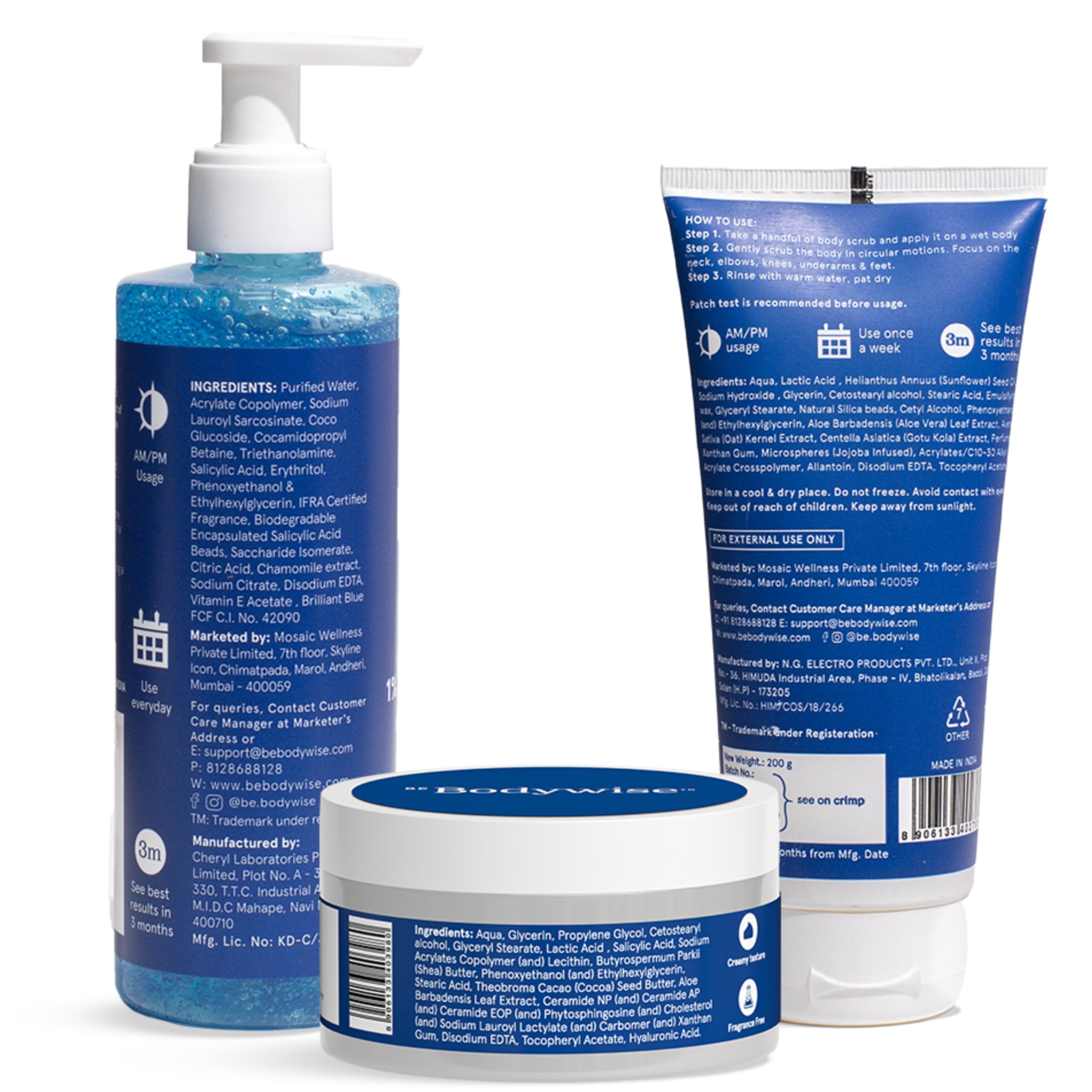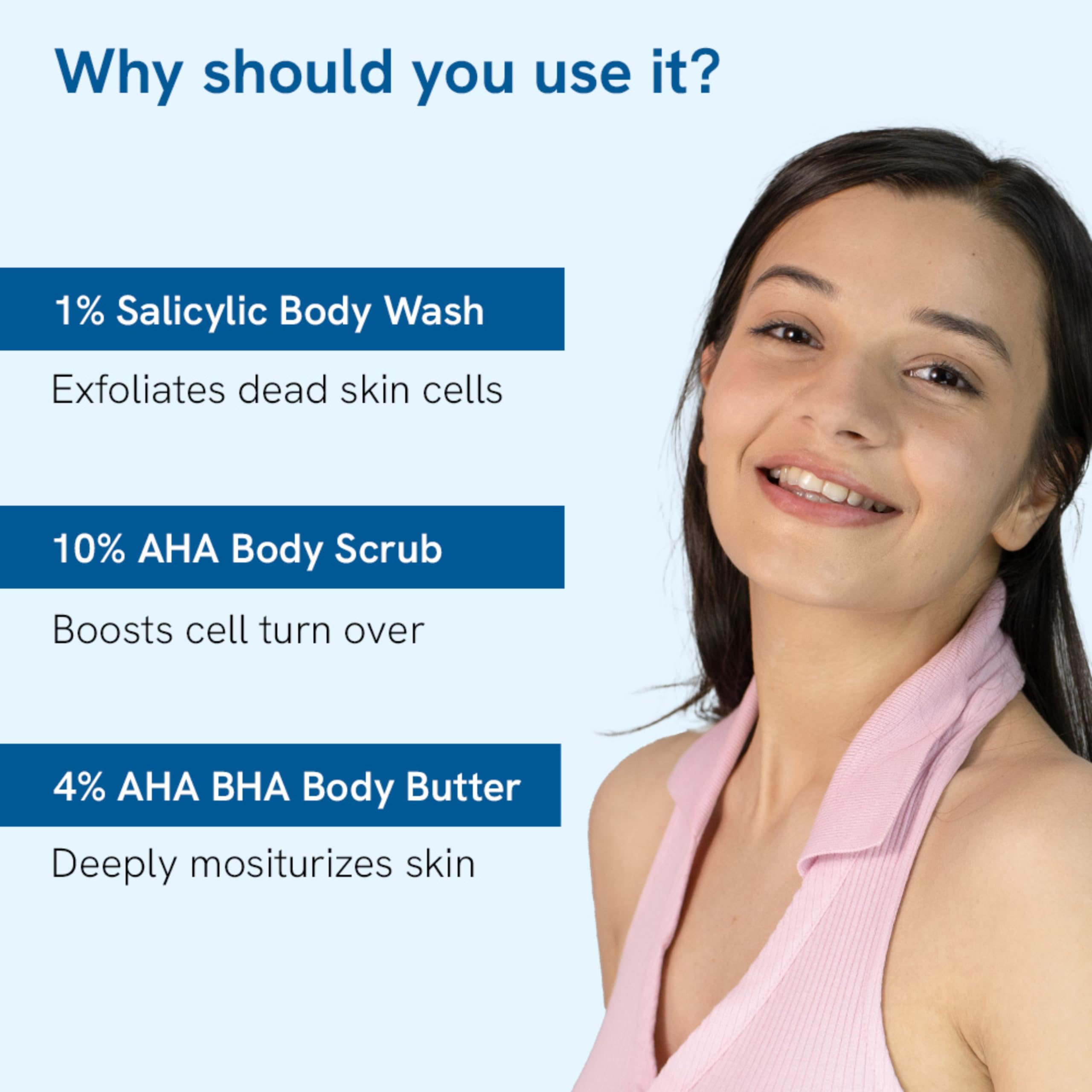 Be Bodywise Strawberry skin - Advanced Moisturization pack | 10% AHA Body Scrub (200g)1% Salicylic Acid Body Wash (250ml) & 4% AHA BHA Body Butter (200g) | Smooth Radiant Skin | Paraben & SLS free