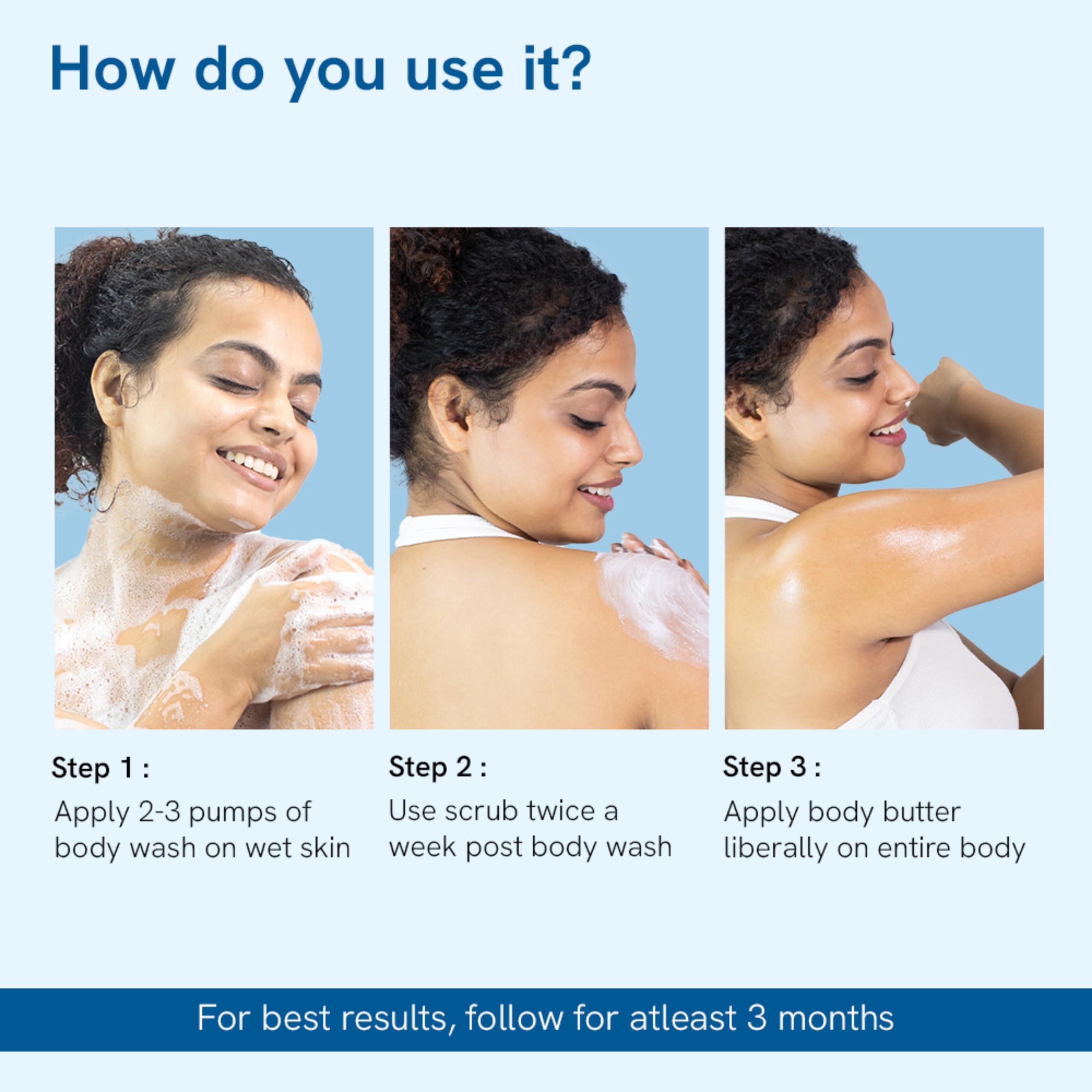 TAN-BE-GONE: Our 10% AHA body scrub and Be Bodywise 4% AHA BHA Body Butter are formulated to de-tan your skin revealing a brighter complexion. The oat extract in the scrub and hyaluronic acid in the body butter contribute to a more even skin tone.