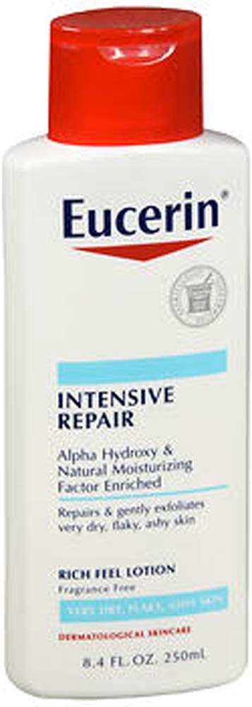 Eucerin Intensive Repair Lotion 8.4 oz (Pack of 2) - Eucerin Intensive Repair Body Lotion immediately restores skins radiance and delivers 24-hour hydration. This Eucerin Intensive Repair lotion contains a unique 3-dimensional formula that is enriched with Alpha Hydroxy and Natural Moisturizing Factors and moisturizes exfoliates and conditions very dry flaky skin. The intensively moisturizing formula in this unscented body lotion immediately improves the skins appearance. This Eucerin body lotion is fragrance-free dye-free and paraben free so it's ideal for those with sensitive skin and is gentle enough for use as a daily dry skin repair lotion. This body moisturizer is perfect as a very dry skin lotion and can also be used as a hand lotion or foot lotion. To use smooth this Eucerin-sensitive skin lotion onto your body daily. Eucerin is a dermatologist-recommended skincare brand that is based on an uncompromising approach to science. With skin care products designed to restore and sustain healthy-looking skin families everywhere look to Eucerin to enhance outer beauty and self-confidence. HOW TO USE: Smooth over body daily. Caution: Keep out of reach of children. For external use only. Avoid contact with eyes. Discontinue use if irritation occurs.