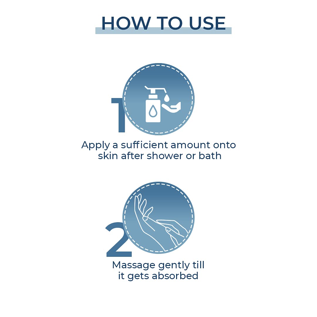 • DIRECTIONS FOR USE: Apply a sufficient amount onto skin after shower or bath. Massage gently till it gets absorbed. For the best results use twice a day AM & PM