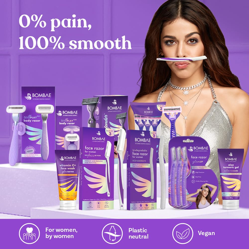 SALON-SMOOTH SKIN: Get parlor-finish for eyebrows forehead upper lips lower lips chin peach fuzz & sideburns with Bombae face razor KOREAN GLASS SKIN: Bombae facial hair remover for women exfoliates dry dead skin and primes skin for flawless makeup application EASY GRIP: Anti-slip grip with rust free and high precision blades for smooth shave without nicks and cuts GENTLE & PAINLESS: No nicks no cuts no pain with Bombae facial & upperlip hair removers for women AT-HOME BEAUTY RITUAL: Designed to be soft and gentle on all skin types - oily to combination. Shave every 5-7 days in case of normal growth & 3-4 days in case of accelerated hair growth