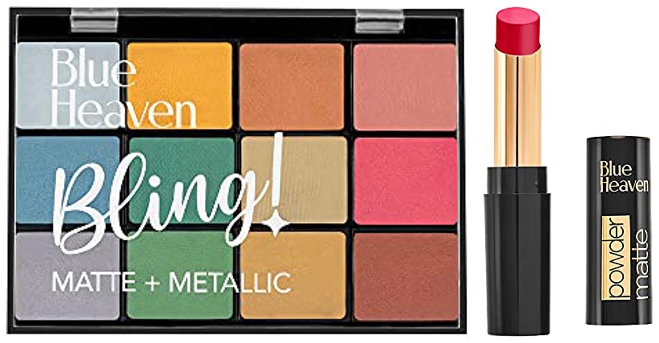 Blue Heaven 12-In-1 Metallic Finish Bling Eyeshadow (Garden Paradise)Blue Heaven Bling Matte and Metallic palette is a 12-IN-1 eyeshadow palette with matte and metallic shades. This palette will add instant glamour to your look and take it from day to night in just a few strokes. The shades are buttery soft and glide on the eyelids creating a smooth non-patchy eyeshadow look. Creating fun young smokey and colourful looks has never been easier - with this must-have palette!Blue Heaven Powder Matte-Ruby Glow Rm03Perfect your look with a range of colours that are sophisticated and playful. And most importantly long lasting. The Blue Heaven powder matte glides on effortlessly and gives your pout an unbelievable soft matte finish while hydrating your lips. Now at affordable prices so you can the best of beauty without having to break your budget.
