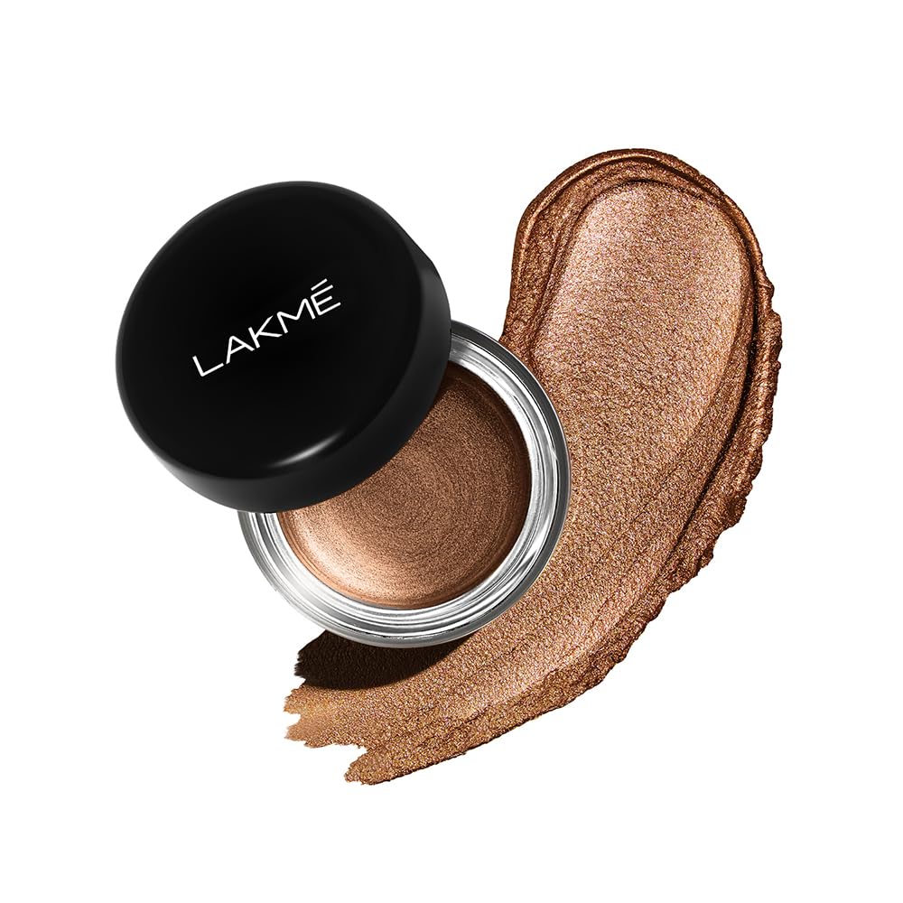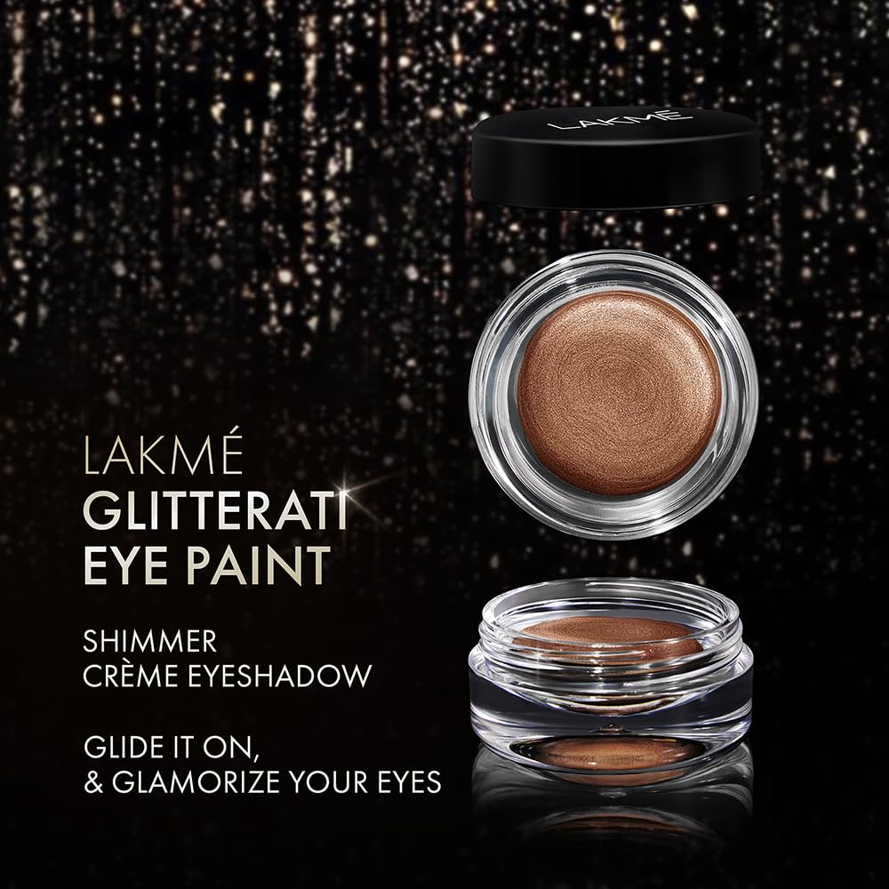Eye change the game with every swipe with the new LAKME Glitterati Eye Paint. A sensational Creme eyeshadow that defines glamor and casts a shimmering glittery spell upon your eyes. Bedazzle your inner diva with timeless elegance or embrace the captivating allure of your inner artist with its 7 dazzling shades. Its oh-so-luxe Creme texture and rich pigment make you shine like a showstopper with a high-volt touch of shimmer. Swipe on the glam and wear it solo for an intense pop of sparkle that never dims. Or get creative and layer it with matte eyeshadows to create a look that gets on your showstoppin' bling! You can also use it as a liner. Enriched with cocoa butter it's designed to prevent your lids from feeling dry as you shine through the night. Its crease resistant qualities let you play and slay like never before. Its smooth Creme texture ensures effortless application making it the perfect eyeshadow for those who never settle and are never subtle. Drenched in luxury and glamour it's designed to add a touch of dazzling brilliance to your look. So swipe on shine on and seize the runway like never before with the new LAKME Glitterati Eye Paint.