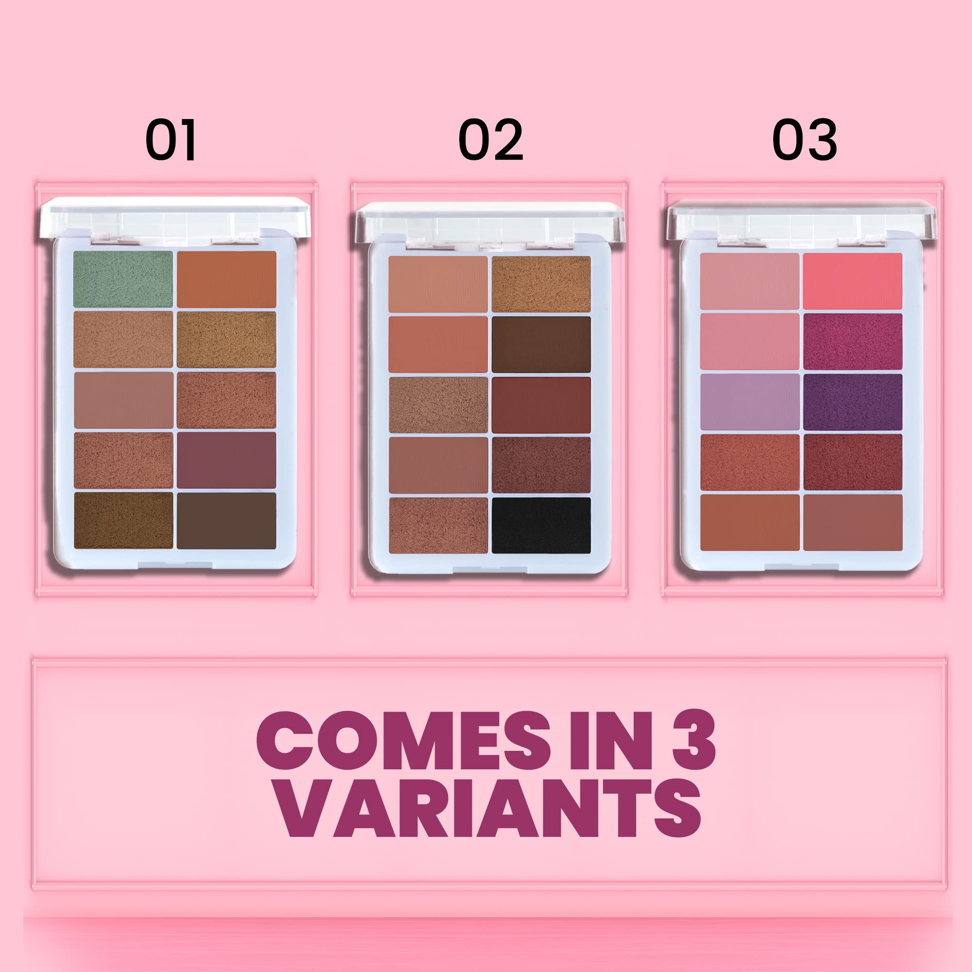 MARS Shimmer and Matte Eyeshadow Palette features 10 highly pigmented and blendable shades for you to create a multitude of stunning eye makeup looks. Available in 3 variants the palette offers versatile options from soft and natural to bold and daring ensuring endless possibilities. The richly pigmented eyeshadows deliver intense color payoff that lasts all day without creasing or fading. Minimal fallout ensures a polished finish while the buttery smooth formulation provides a natural-looking highly pigmented finished look. Compact in size this palette is easily accessible and convenient for touch-ups on-the-go.