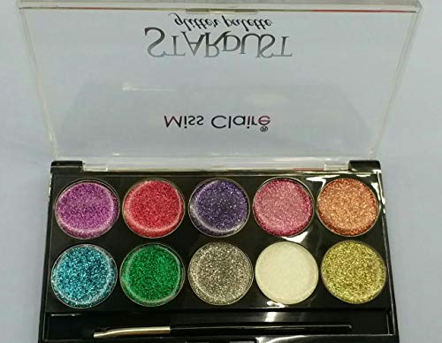 Miss Claire 10 Color Glitter Eyeshadow The tones of the Miss Claire Eyeshadow Palette are highly blendable with an amazing texture that is universally flattering and looks natural on all skin types!! This pack has 10 colors of eyeshadow where each Color Is Unique Beautiful Super Shiny And Pigmented. It's Easy To Use And Looks Great On Your Eyes. This palette is made of only the quality ingredients to provide you a fresh and long-lasting makeup all day long! Apply the eyeshadow once and enjoy the looks for all occasions. Many colours to choose your perfect eyeshadow colour from. Mix and match colors. Perfect Suit For Smoky Eyes Makeup Wedding Makeup Party Makeup Or Casual Makeup. How to apply: a)Colour entire eye area b)Shade Lid c)Contour Crease d)Line Around Eye