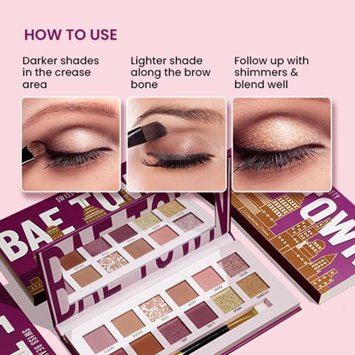 Introducing the Swiss Beauty Bae Town Eyeshadow Palette your perfect companion for creating captivating eye looks that mirror the beauty of a picturesque journey. This palette features 12 stunning eyeshadows that are perfect for creating versatile looks inspired by your favourite travel destinations. With a mix of matte shimmer and metallic finishes you can create endless looks that suit any occasion. The easy-to-use palette comes with an eye brush that helps you seamlessly blend your favourite shade on your lids. With its smooth texture and high pigmentation this palette allows you to effortlessly blend and build stunning eye looks that will turn heads wherever you go. Whether you're exploring the streets of a new city or simply dreaming of your next adventure the Swiss Beauty Bae Town Eyeshadow Palette is compact and travel-friendly making it ideal for on-the-go touch-ups or packing for your next adventure.