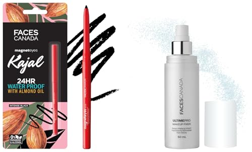 FACES CANADA Ultime Pro Makeup Fixer 50 ml | Long Lasting Makeup Setting Spray | Keeps Makeup Intact | Hydrates Soothes & Refreshes Skin | Hyaluronic Acid & Vitamin E Enriched | No AlcoholTired of the last moment touchups the annoying smudged eyeliner and kajal or the uninvited cracking foundation and eyeshadow creases? Well it is time to bid them goodbyes with the Faces Canada Ultime Pro Makeup Fixer. The Faces Canada Ultime Pro Makeup Fixer is a light in weight makeup fixing spray that flawlessly locks your makeup and gives it an all day long freshness. The Ultime Pro Makeup Fixer increases the staying power of your makeup and also stunts makeup meltdowns. The Ultime Pro Makeup Fixer is enriched with the goodness of Moringa Chamomilla Matricaria flower extract Caffeine and Hyaluronic acid that not only keeps the skin hydrated but also protects it from harmful pollutants and radicals. The Faces Canada Makeup Fixer has a unique non-sticky and refreshing formula for an unblemished look. Use the Faces Canada Makeup fixer for final detailing and touches.FACES CANADA Magneteyes Kajal - Black 0.35g | 24 Hr Long Stay | One Stroke Smooth Glide | Waterproof Smudgeproof & Fadeproof | Deep Matte Finish | Enriched With Almond Oil & Vitamin EThis new kajal is made with a unique smudge and fade proof formula is transfer resistant and keeps you stunning all day. Super soft and easy to apply this alluring kohl is loaded with antioxidants and minerals and is completely free of paraben.