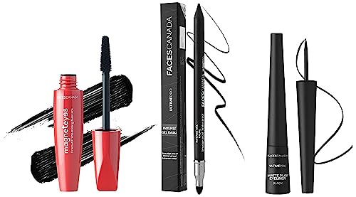 Faces Canada Ultime Pro Matte Play Eyeliner 01 Black 2.5 mlFaces ultime pro matte eyeliner has excellent colour pay off and high coverage. Matte finish brings depth to eye looks contrasting with the skin's texture for an effect that looks strikingly modern. It delivers the deepest pigment line and is easy to apply. For eyes that turn heads this is a much required quick drying liquid to matte liner that delivers full colour for up to 17 hours and more. The eyeliner is waterproof and sweat proof. It is dermatologically and opthalmologically tested. Black is the colour that is must have in your range. To get your bold confident and sharp look every day add the black matte eyeliner.Faces Canada Ultime Pro Intense Gel Kajal 1.2 g With Free Sharpener (Black)Getting unattractive âpanda eyesâ from smeared eyeliner can be annoying. Never settle for messy eyeliners that give you that unwanted tired appearance. Choose the Ultime Pro Intense Gel Kajal Black Eyeliner from Faces Canada! Made to match your active always-on-the-go lifestyle our black gel eyeliner stays on from day till night.Lasts for 12 HoursStay confident and always be prepared for a lovely evening out with your girlfriends after work. This long-wearing gel eyeliner pencil stays on for 12 hours without budging. You wonât need to worry about it fading or spreading. Itâs also waterproof and smudge-proof so sweat and unpredictable weather are out of the question!Cop the Smokey Eye EffectBuilt with a smudger on the other end our eyeliners can instantly help you achieve the classic smokey eye. With a little rub on the edges it gives you a professional finish in minutes.One-Swipe ApplicationSoft and smooth this black waterproof eyeliner glides easily on your lid. It leaves behind a clean and striking finish without overlapping and streaking.It comes with a small sharpener too so you can customize the thickness and sharpness of your eye liner pencil.Made to Love Your SkinOur black eyeliner pencil is dermatologically and ophthalmologically backed to make sure itâs safe and kind on your skin. The formulation is cruelty-free and paraben-free.A Girlâs Best FriendGift the beautiful people in your life with our glossy and sleek black kajal eyeliners! With its user-friendly body and gel finish itâs an essential item to every modern womanâs makeup set.Up your eye makeup game with the Ultime Pro Intense Gel Kajal Black from Faces Canada!Faces Canada Magneteyes Dramatic Volumizing Mascara Black 9.5 mlFaces magnet eyes dramatic volumizing mascara black.