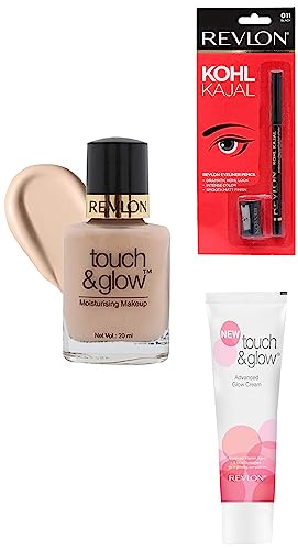Revlon Touch and Glow Liquid Make Up Ivory Mist 20ml & Revlon Kohl Kajal Eye Liner Pencil With Sharpener Black 1.14g & Revlon Touch and Glow Advanced Fairness Cream (75g)