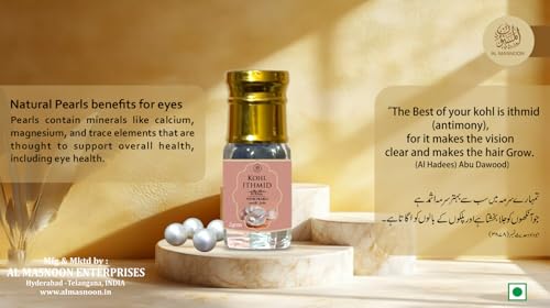 Discover the exquisite fusion of tradition and luxury with Al Masnoon Kohl Ithmid Surma enriched with Natural Pearls (Moti). This 5g pack of kohl offers a rich deep color while incorporating the rare and precious qualities of natural pearls known for their unique benefits and beauty-enhancing properties.Al Masnoon Kohl Ithmid Surma offers a luxurious blend of traditional Arabic eyeliner with the added benefits of natural pearls. This unique formulation not only delivers a stunning eye color but also nourishes and enhances the health of your eye area.