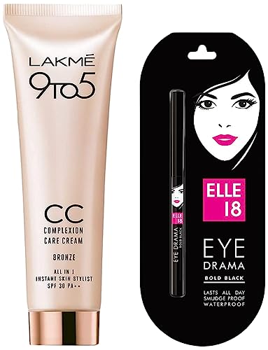 Elle 18 Eye Drama Kajal Bold Black 0.35gAdd more charm to your eyes with this Elle 18 Eye Drama from Elle 18. The Elle 18 Eye Drama is long lasting Kajal in a twist-up format. This dermatologically tested kajal is just what you need for completing your eye makeup or carrying a simple only-kajal look. It's a smudge proof water proof kajal and can add the dramatic and glamorous look to your eyes. It has intense matte texture and you can experiment with a thin line or a bold wing this kajal is great for day and night looks. Its long-lasting- up to 12 hours without smudging and is completely water proof. It is designed with an easy to use and convenient twist-up format. Just one stroke of the Elle 18 Eye Drama enhances your simple look to a more stylish avatar. You are incomplete without Elle 18 Eye Drama and this is a perfect everyday product! Get the Elle 18 Eye Drama in black now. The Elle 18 Eye Drama goes best with your looks further be it a wedding party and work look. Line your upper and lower eyelid with a rich coat of the Elle18 Eye drama Kajal. Draw from the inner corner towards the outer corner and join the line to form an upward wing. Its size and moisturizing properties makes this the perfect travel kajal for everyday use. Buy Now!Lakmé 9 to 5 Complexion Care Face Cream Bronze 30gFor women who are on the go and could use the extra minutes before stepping out Lakme CC cream is here to the rescue. This cream acts as your everyday mini skin stylist and lets you get that perfect look of makeup + skincare for any occasion. It may be work party or simply an evening with friends your personal stylist will help you get the right look for it all. Itâs time to move on to a simpler regime without comprising on skincare. The Lakme CC cream moistures brightens and freshens your skin while enriching it with a hint of makeup. With sun protection of SPF 30 and makeup benefits like even skin tone and skin coverage this cream takes complete care of your complexion. The beige variant of this CC cream blends in seamlessly when applied on a slightly duskier skin tone. This cream can also be used along with other products or on its own if you prefer just the lightest touch of make-up. This travel pack is compact and easy to carry â which makes it just like taking your mini stylist everywhere. Furthermore the Lakme CC cream comes in a chic sturdy packaging with a well fitted rose gold cap. Lakme 9 to 5 CC Cream brings you the best of both worlds: Itâs skincare with a touch of makeup to give you the perfect look for any occasion in an instant.