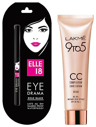 Elle 18 Eye Drama Kajal Bold Black 0.35gAdd more charm to your eyes with this Elle 18 Eye Drama from Elle 18. The Elle 18 Eye Drama is long lasting Kajal in a twist-up format. This dermatologically tested kajal is just what you need for completing your eye makeup or carrying a simple only-kajal look. It's a smudge proof water proof kajal and can add the dramatic and glamorous look to your eyes. It has intense matte texture and you can experiment with a thin line or a bold wing this kajal is great for day and night looks. Its long-lasting- up to 12 hours without smudging and is completely water proof. It is designed with an easy to use and convenient twist-up format. Just one stroke of the Elle 18 Eye Drama enhances your simple look to a more stylish avatar. You are incomplete without Elle 18 Eye Drama and this is a perfect everyday product! Get the Elle 18 Eye Drama in black now. The Elle 18 Eye Drama goes best with your looks further be it a wedding party and work look. Line your upper and lower eyelid with a rich coat of the Elle18 Eye drama Kajal. Draw from the inner corner towards the outer corner and join the line to form an upward wing. Its size and moisturizing properties makes this the perfect travel kajal for everyday use. Buy Now!Lakmé Complexion Care Face Cream Beige 9gFor women who are on the go and could use the extra minutes before stepping out Lakme CC cream is here to the rescue. This cream acts as your everyday mini skin stylist and lets you get that perfect look of makeup + skincare for any occasion. It may be work party or simply an evening with friends your personal stylist will help you get the right look for it all. Itâs time to move on to a simpler regime without comprising on skincare. The Lakme CC cream moistures brightens and freshens your skin while enriching it with a hint of makeup. With sun protection of SPF 30 and makeup benefits like even skin tone and skin coverage this cream takes complete care of your complexion. The beige variant of this CC cream blends in seamlessly when applied on light to wheatish skin tone. This cream can also be used along with other products or on its own if you prefer just the lightest touch of make-up. This travel pack is compact and easy to carry â which makes it just like taking your mini stylist everywhere. Furthermore the Lakme CC cream comes in a chic sturdy packaging with a well fitted rose gold cap. Lakme 9 to 5 CC Cream brings you the best of both worlds: Itâs skincare with a touch of makeup to give you the perfect look for any occasion in an instant.