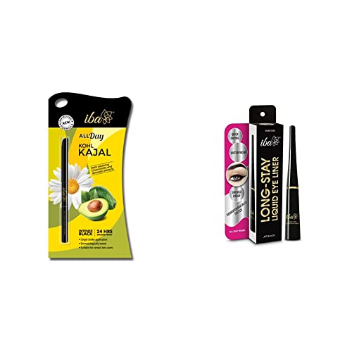 Iba Long Stay Liquid Eyeliner, Jet black, 6.5ml & Iba All Day Kohl Kajal, Jet Black, 0.35g l Smudge Proof l Waterproof l 24 hr Long Lasting l Vegan & Cruelty Free
