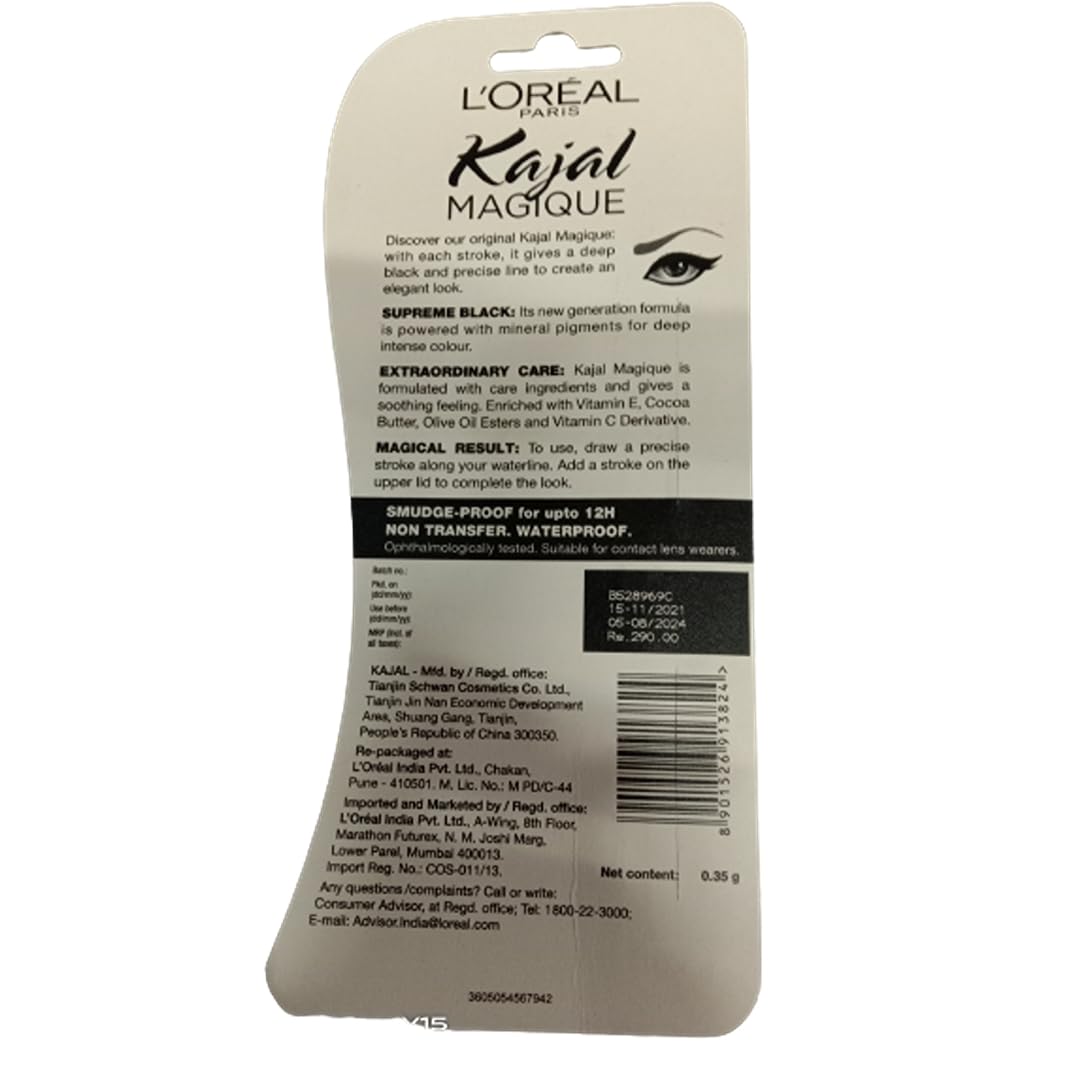 L'Oreal Paris Kajal Magique is supremely black Kajal that doubles up as a darker-than-night eyeliner. Along with providing a great finish it is also enriched with ingredients like Vitamin E Cocoa Butter Olive Oil Esters and Vitamin C Derivative to provide extraordinary care for your eyes. LâOreal Paris India offers the complete range of makeup. You can volumize and lengthen your lashes with our collection of mascaras achieve sleek lines with smudge-proof eyeliner add natural looking definition to your brows and discover eyeshadow palettes. Create your perfect eye makeup look with L'Oréal Paris India. Smudge proof for up to 12 hours non transfer waterproof. A new generation formula powered with mineral pigments for deep intense colour. Formulated with care ingredients & enriched with vitamin E cocoa butter olive oil esters and vitamin C. Suitable for sensitive eyes and contact lenses.
