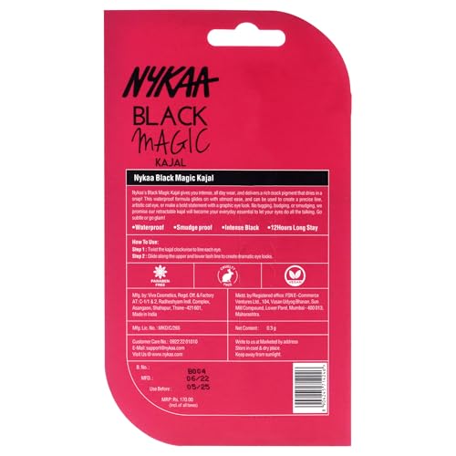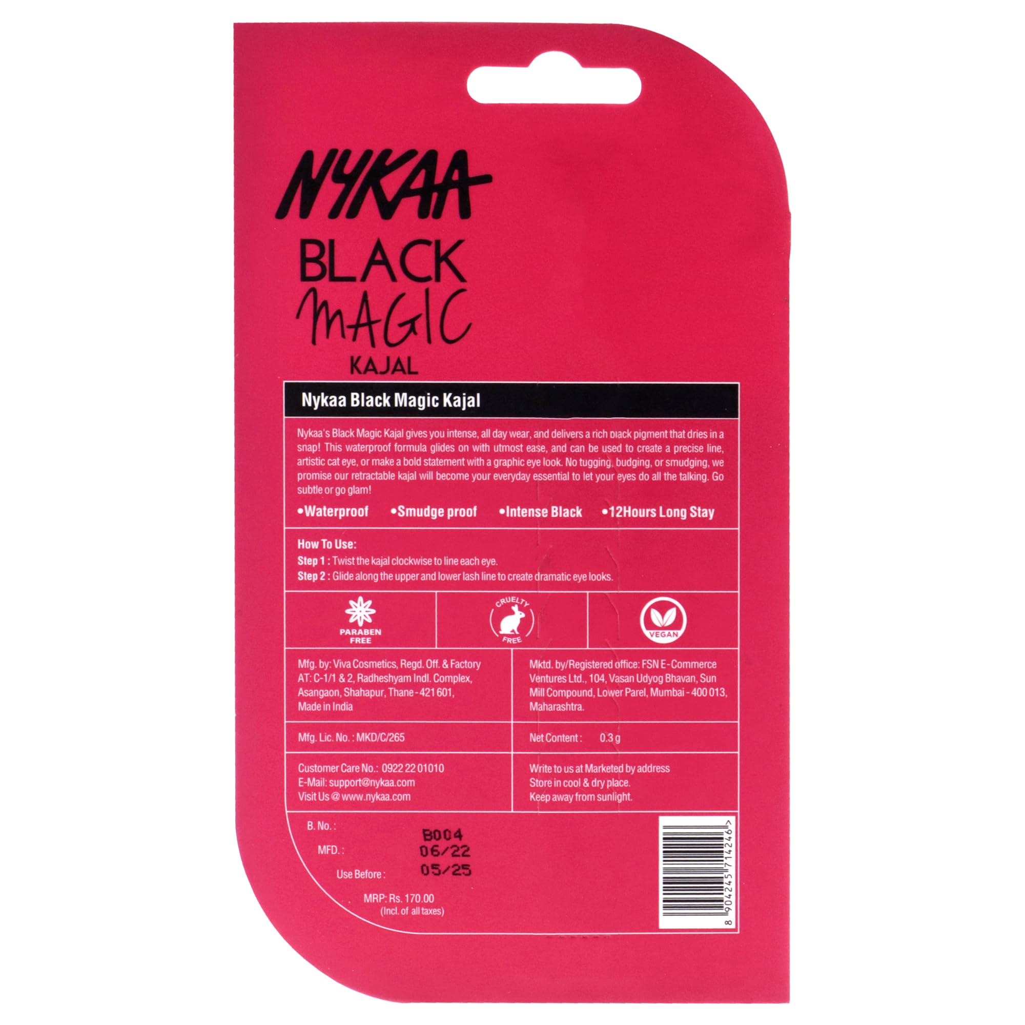 It's time to up your eye game with Nykaa's Black Magic Kajal. A must-have for everyday wear this is a soft and creamy formula which leaves a subtle matte finish. Its rich and intense black pigment needs just one stroke and you are ready to rock any look. This waterproof smudgeproof and anti-irritant kajal will give your eyes more depth so say hello to beautiful eyes!