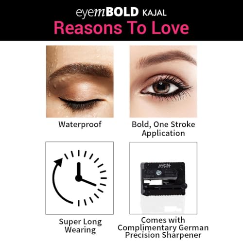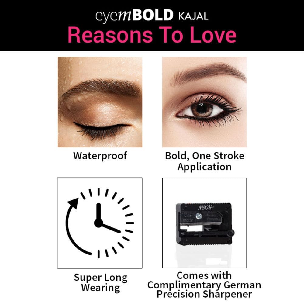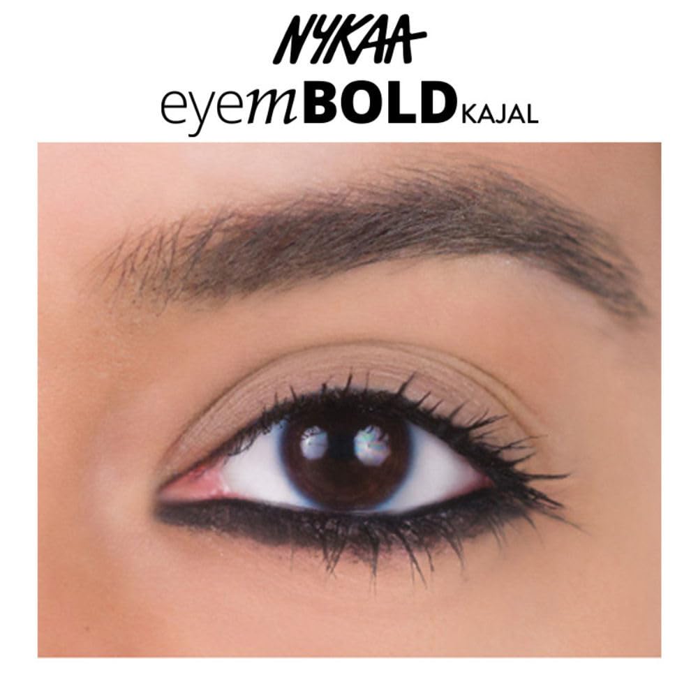 Get the gel finish in the ease of a pencil with Nykaa Eyem BOLD kajal. is for the days you want to look extra bold and sassy! This kajal locks down the intense black pigment in a matter of seconds to give you bold beautiful eyes. The waterproof formula stays put all day long without smudging or transferring.