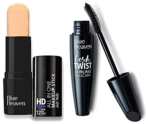 Blue Heaven HD All In One Makeup Stick Silk Matte - 101 Vanilla-Very Fair 10gmBlue Heaven HD All-in-One Makeup Stick is the ultimate multi-utility makeup solution. Use it as a foundation to get the perfect base concealer to blur imperfections colour correct to correct undertones and contour to highlight your favourite features. Available in 6 shades to match every Indian skin-tone. Easy to carry and easy on the pocket too.Blue Heaven Lash Twist Mascara Black 12 mlOur volumising mascara creates massive volume without weighing down lashes leaving your eyes with bigger bolder lashes. Our special silicon curling wand gives each lash a twist and lift. Never worry about runny mascara with our anti-clumping waterproof formula that lasts for 12 hours.