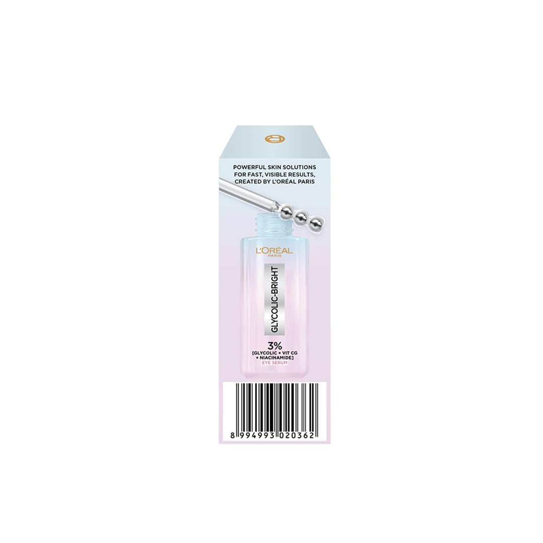 Discover the newest innovation from L'Oral Paris the Glycolic Bright Dark Circle Eye Serum. The concentration of 3% Glycolic Acid paired with Vitamin CG and Niacinamide gives both immediate and long-term brightening results to the undereye. Scientifically formulated for eye contour fragrance-free & ophthalmologically tested.