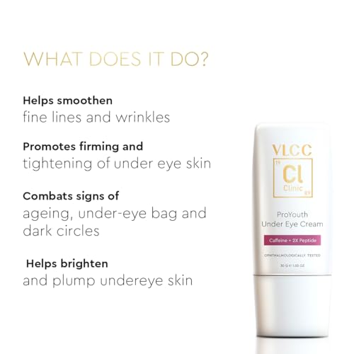 • 4) FADES SIGNS OF AGEING: VLCC Pro Youth Eye Cream is enriched with peptides known for its hydrating and anti-aging benefits that help increase collagen protection to plump and smoothen skin texture. It also helps reduce fine lines and wrinkles for firm u