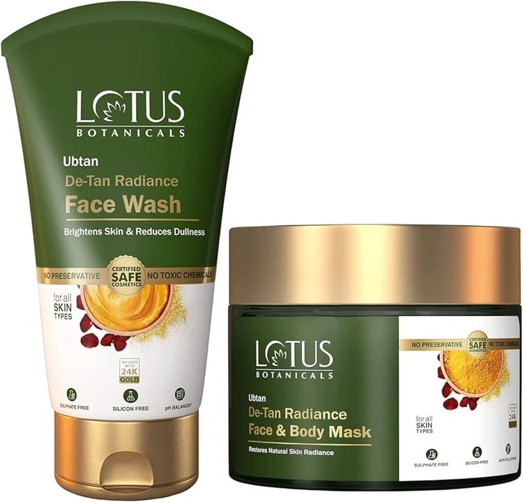 Unveil a radiant and even-toned complexion with the Lotus Botanicals Ubtan De-Tan Face Wash and Face and Body Mask set. The 100g de-tan face wash gently exfoliates and removes stubborn tan while the 200g face and body mask deeply nourishes and brightens dull skin. Enriched with natural ingredients like turmeric saffron and sandalwood this set effectively combats sun damage blemishes and uneven skin tone. Experience a revitalised and glowing appearance with this indulgent skincare duo. Suitable for all skin types it's a must-have for those seeking a comprehensive solution to achieve a flawless luminous complexion.
