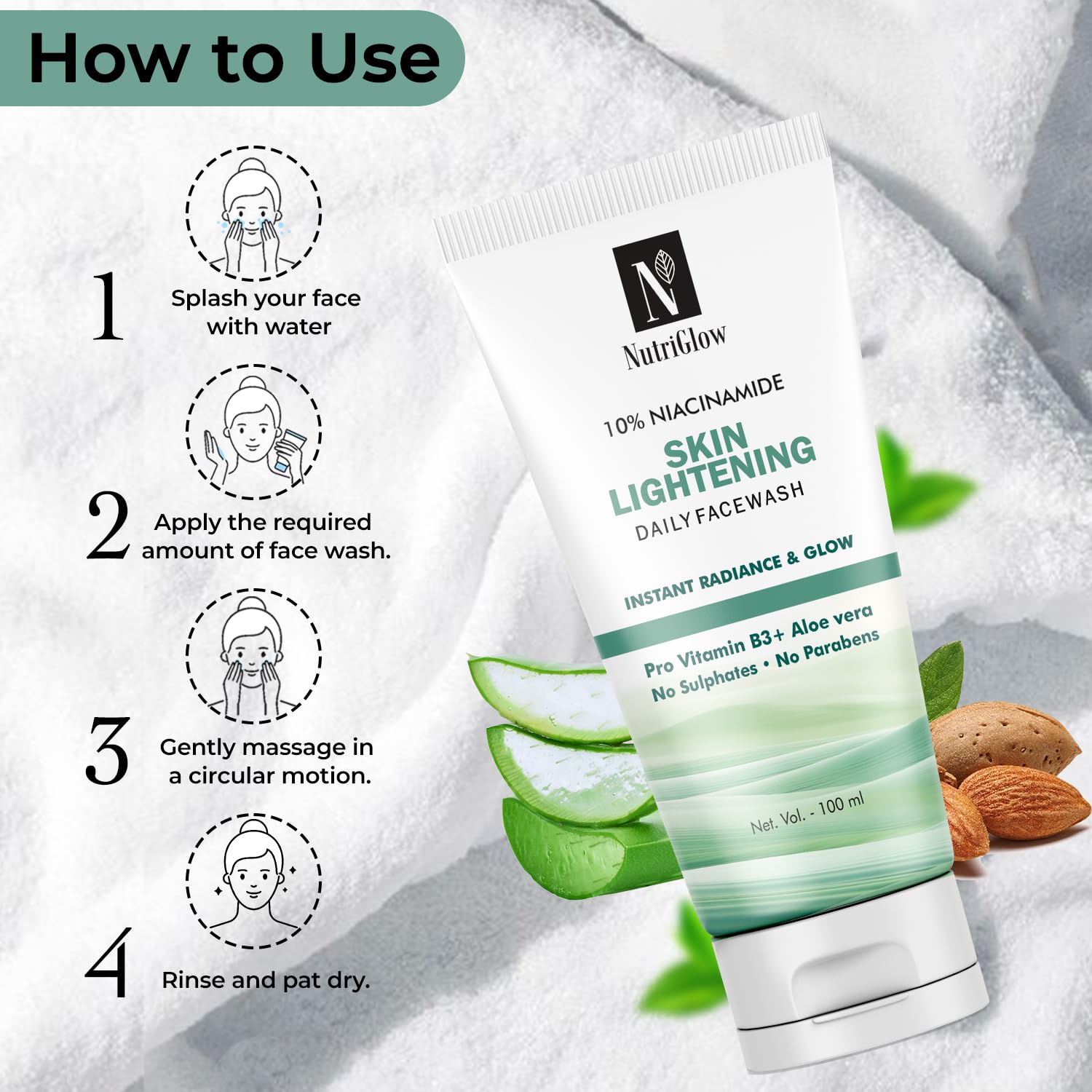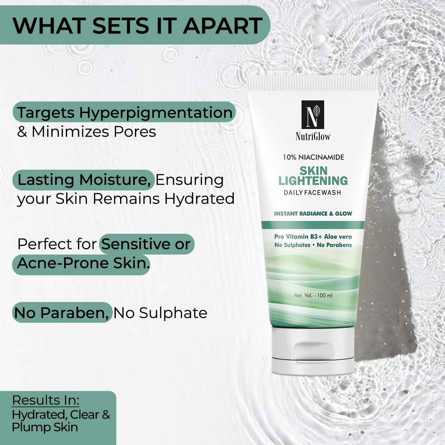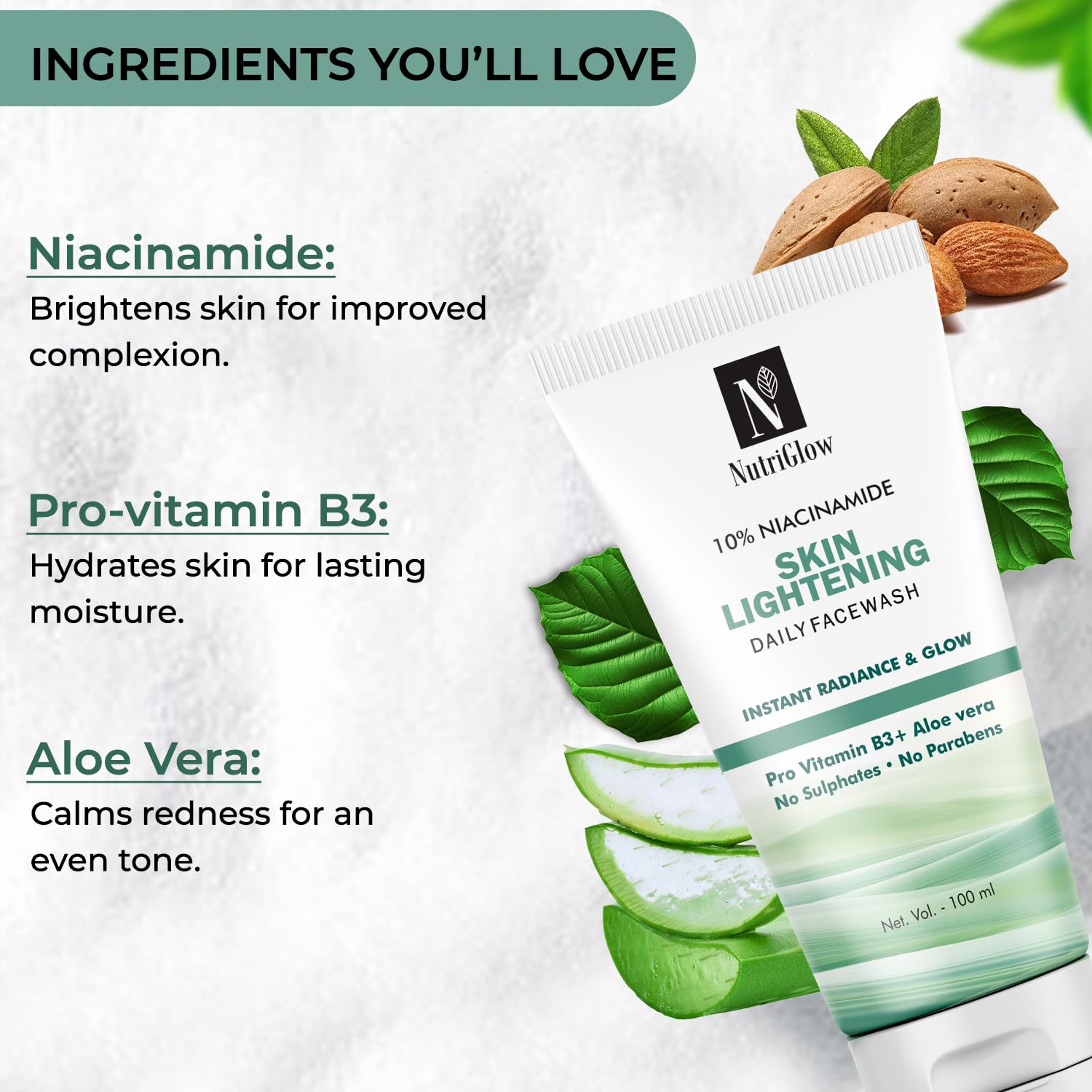 HomeBeautyFace CareCleansersFace WashNutriGlow 10% Niacinamide Daily Face Wash Brightening Formula with Pro Vitamin B3 Aloe Vera Paraben Free All Skin Types For Men And Women (100ml)