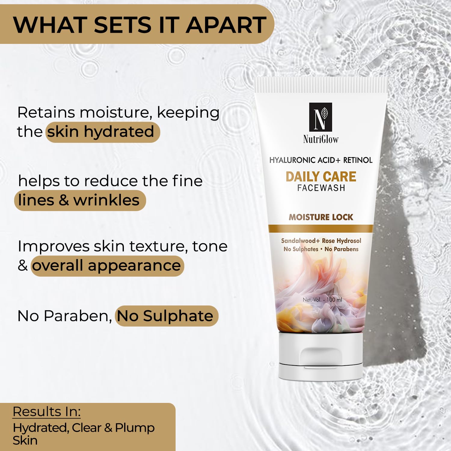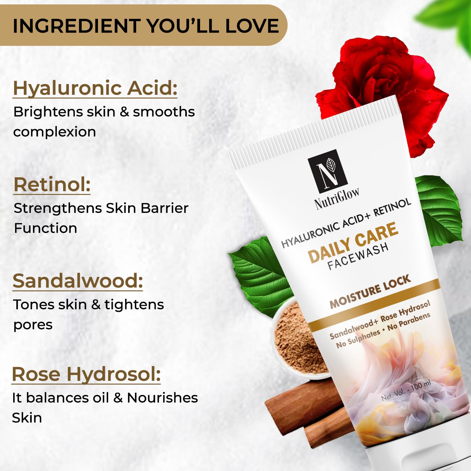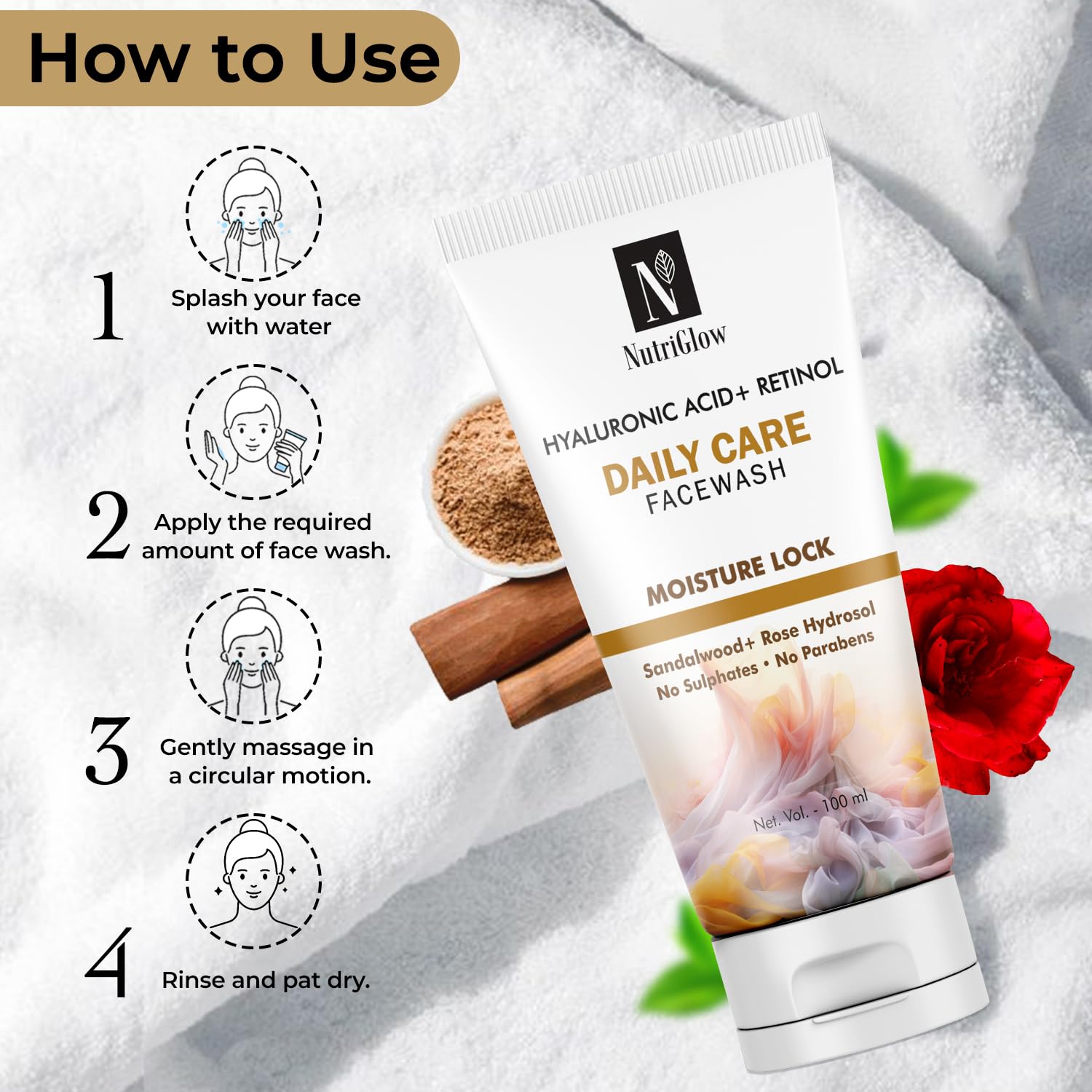 Crafted with the luxurious pure extracts of sandalwood rose hydrosol papaya extracts & watermelon this NutriGlow Hyaluronic Acid & Retinol Daily Care Face Wash has the potential to address various skin aging concerns. With time & age our skin starts to lose the collagen; that is where retinol comes into play. Often retinol is recommended to be used earlier because it offers the long-term benefit of keeping your skin supple & youthful. It helps fight many skin aging signs like dark circles wrinkles crowfeet formation dullness & hyperpigmentation. It's gentle on your skin and free from sulfates parabens or other chemical skin irritants ensuring a safe and effective cleansing experience. Suitable for daily use this mild face wash can remove all dirt particles in one wash. You can use it in your day and night skincare routine with a simple application: Rinse the face with water and apply the desired amount. Now gently rub your face and neck to wash off with water again. At last pat dry.