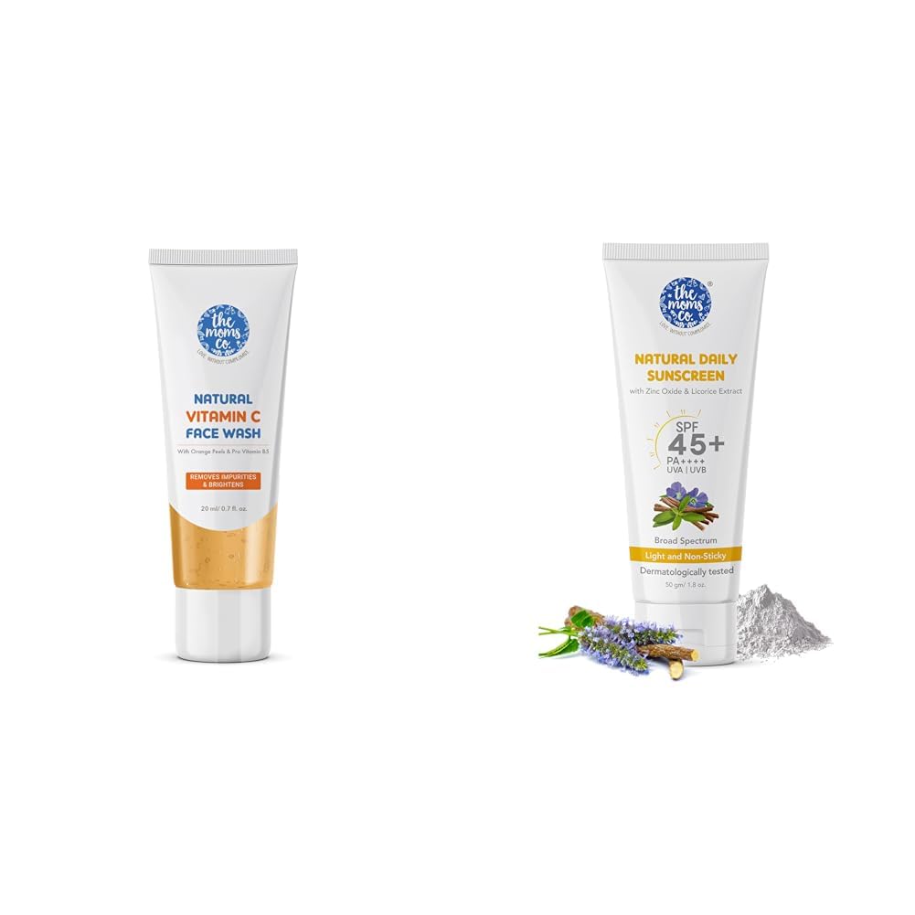 The Moms Co Natural Vitamin C Face Wash for Women & Men I Orange Beads & Chemical Free I 20 ml. Mineral Sunscreen for Women & Men with 25% Zinc Oxide | SPF 45+ PA++++ | - 50 Gm