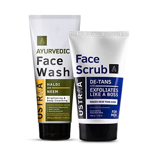 Ustraa De-tan Face Scrub 100g :- For men who spend a lot of time outdoor or sweat it out at the gym this is a must. While a face wash cleans your face the scrub penetrates into the pores of your skin and removes the dead skin. Making the skin healthier. Pollution stress lifestyle that involves eating a lot of junk food smoking or staying up late affects your facial skin health. This ultimately leads to pimples white-heads black heads uneven colour tone and dryness. The Ustraa face scrub helps repair your skin from all that and also de-tanning. With bigger walnut granule sizes it works more efficiently on a man's face as we men have thicker skin. Ustraa Ayurvedic Face Wash Haldi & Neem-200g :- We've unlocked the secrets of skin care and brightening in Ayurveda and packed it all in this face wash. From skin breightening to cleansing this face wash helps keep your skin healthy and clean. It removes excess oil and battles environmental toxins all day offering deep natural care and protection.