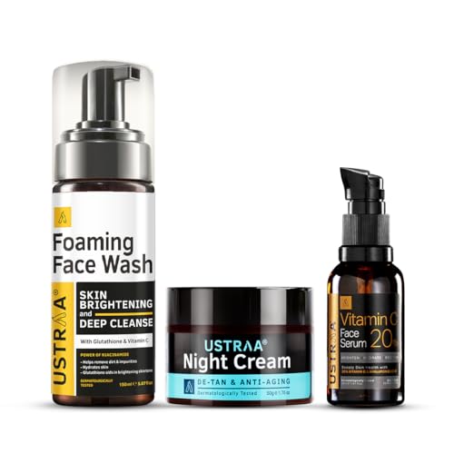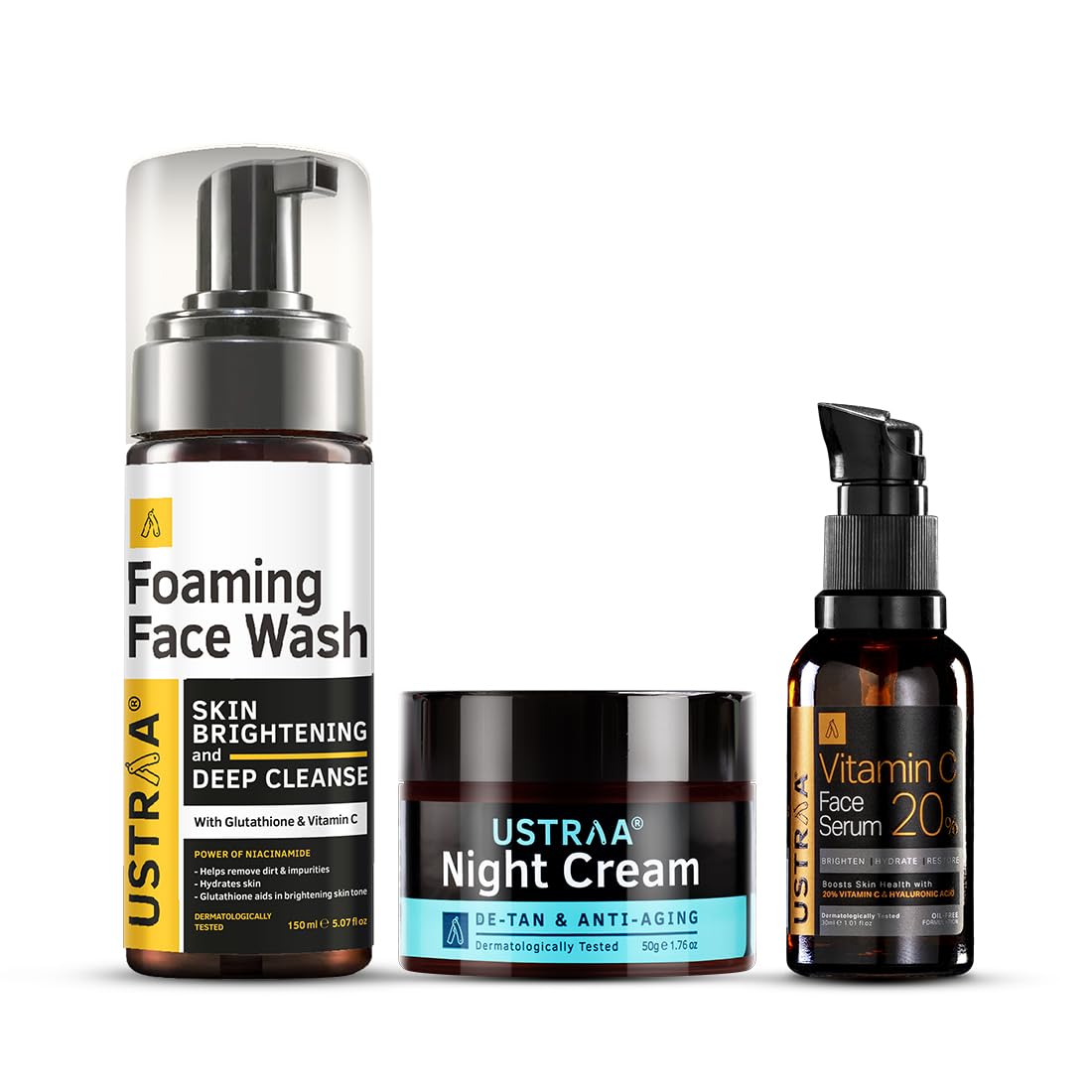 HomeBeautyFace CareCleansersFace WashUstraa Max Brightening Kit - Foaming Face Wash for Skin Brightening - 150 ml | NO SLS & 20% Vitamin C Face Serum - 30ml | 20% Vitamin C & Night Cream De-Tan & Anti-aging - 50g - Effective Tan Removal