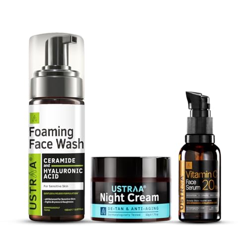 HomeBeautyFace CareCleansersFace WashUstraa Max Gentle Kit - Foaming Face Wash - Sensitive Skin - 150 ml | with Ceramides & 20% Vitamin C Face Serum - 30ml | 20% Vitamin C & Night Cream De-Tan & Anti-aging - 50g - Effective Tan Removal