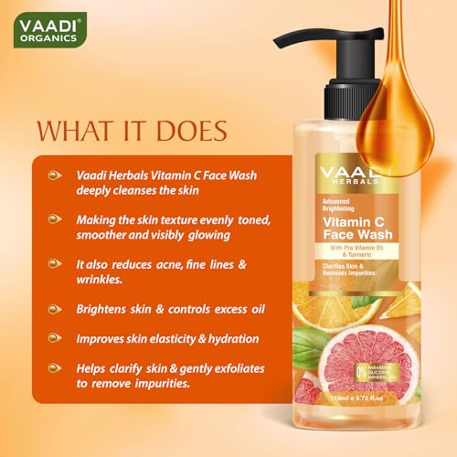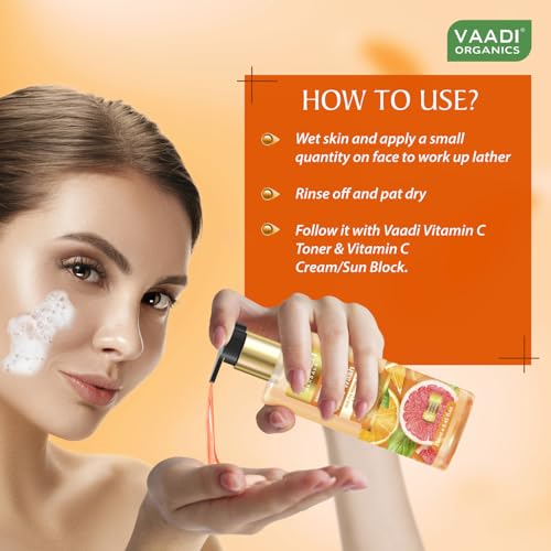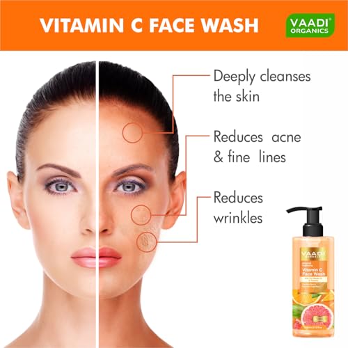 Vaadi Herbals Vitamin C Face Wash deeply cleanses the skin making the skin texture evenly toned smoother and visibly glowing. It also reduces acne fine lines & wrinkles. Vitamin C helps Brightens skin & controls excess oil. Pro Vitamin B5 Improves skin elasticity & hydration. Turmeric Helps clarify skin & gently exfoliates to remove impurities.