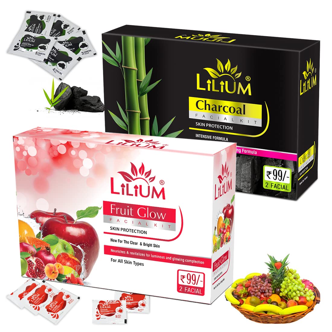 Lilium Charcoal & Fruit Facial Kit Pack of 2 for Glowing Complection and Luminous Nourishes & Revitalizer 60g