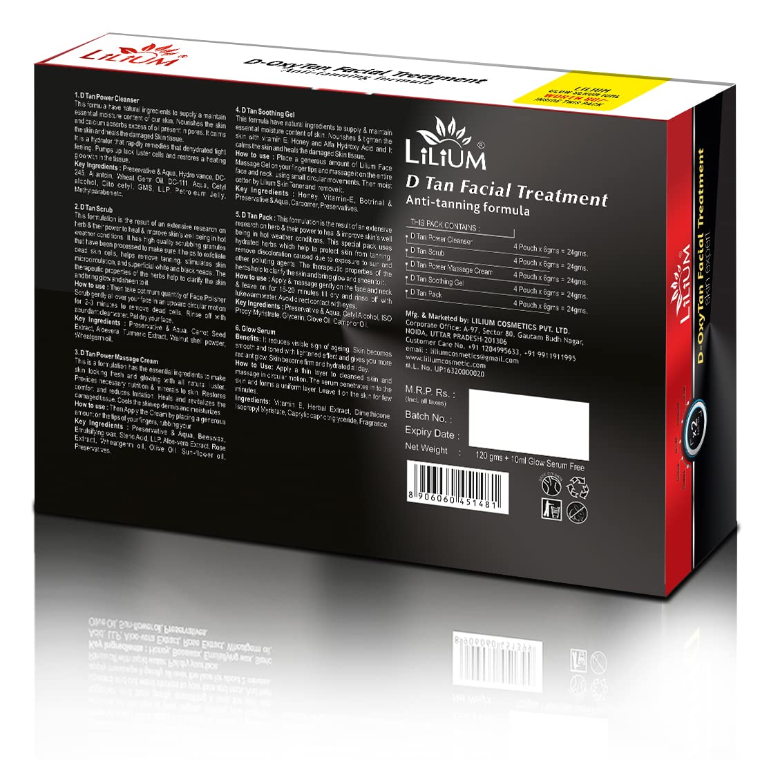 Buy this Product From The House Of Good Choice India on Amazon.in The Lilium D-Oxy Tan Facial Kit" fortified with Actives is a complete "Do it yourself" Facial Kit that can be used at the comfort of your home. In today’s day and age exposure to Sun Pollution and Impurities in our surroundings leaves our skin dull dark and lifeless! Maintaining good skin health is the top most priority for all of us! D-Oxy Tan Facial Kit" helps tackle these skin concerns. Enriched with the concoction of Activated with natural ingredients that are fortified with Actives delivers maximum efficacy with skin rejuvenation benefits for a purified balanced and glowing skin! This kit is suitable for skin types.