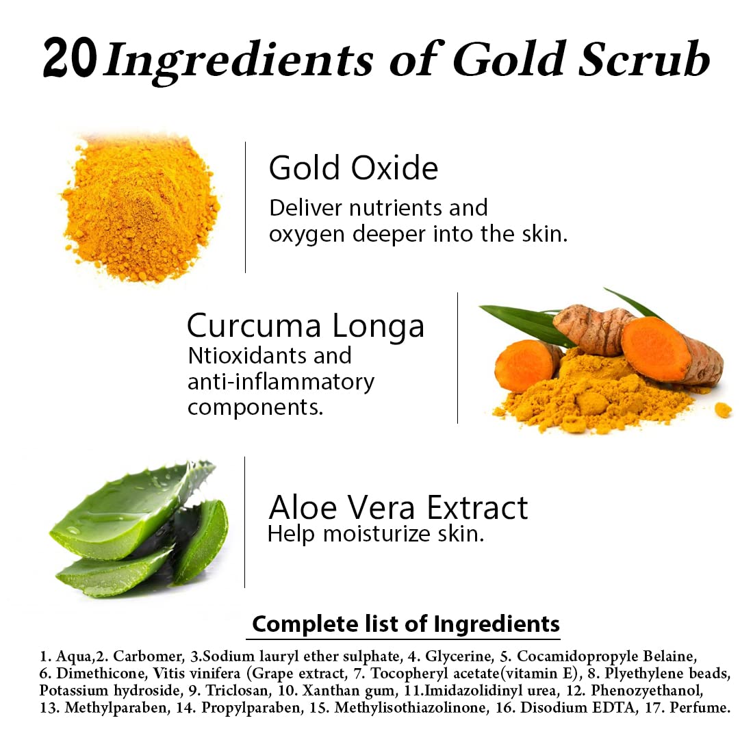 Step 1 and Benefits: Gold facial scrub is mild and pH-balanced to gently deep cleanse your pores of impurities while keeping your skin moisturized. It contains Nano-Gold 24k Technology to keep skin supple and reduce the appearance of wrinkles and fine lin