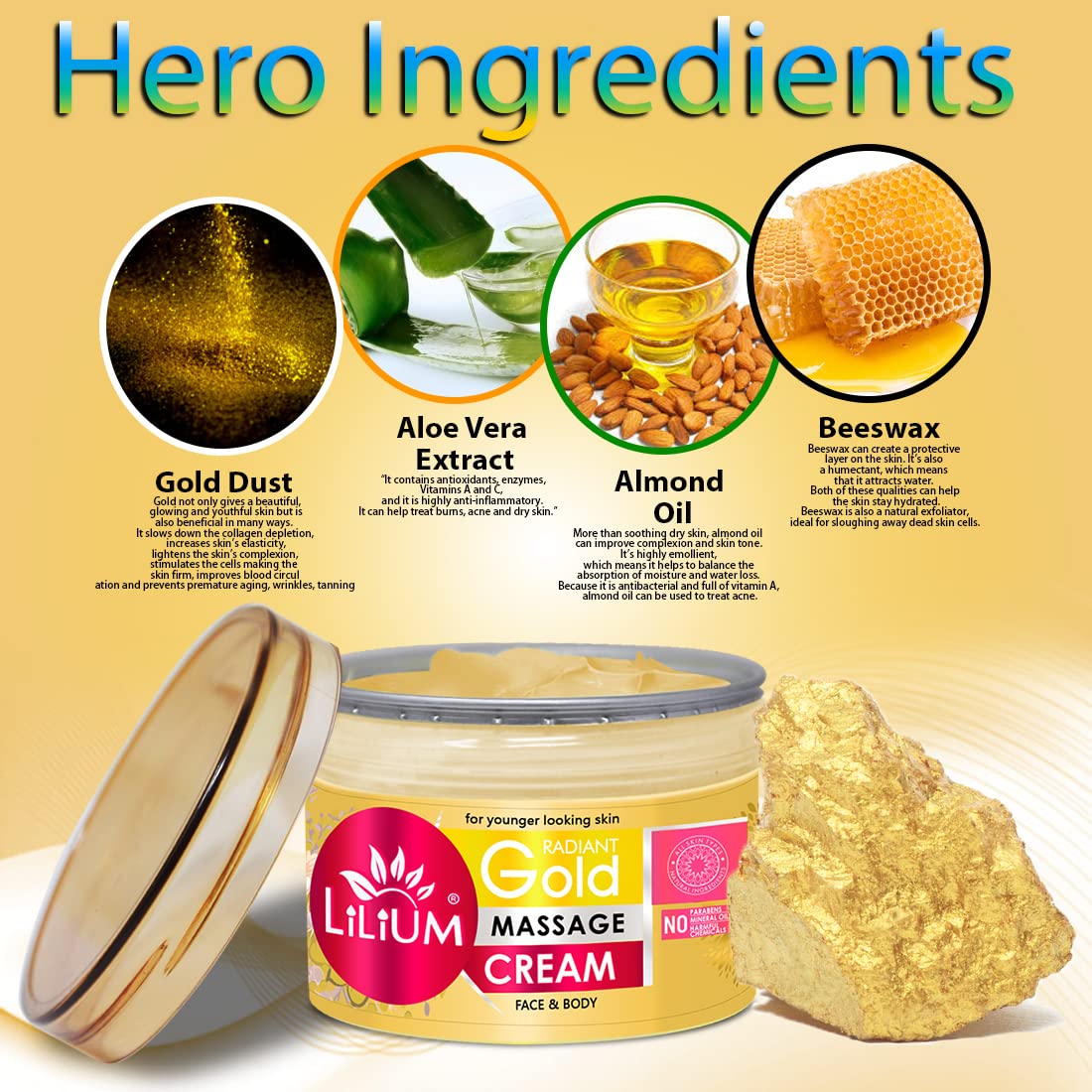 Step 2 and Benefits: 24 Carat Glow Gold massage cream maintain the fairness glow and shine of the skin. It gives a natural lustre and youthful radiance to the skin. The use of gold in skin care dates back to ancient times. Ancient ayurvedic scriptures cla