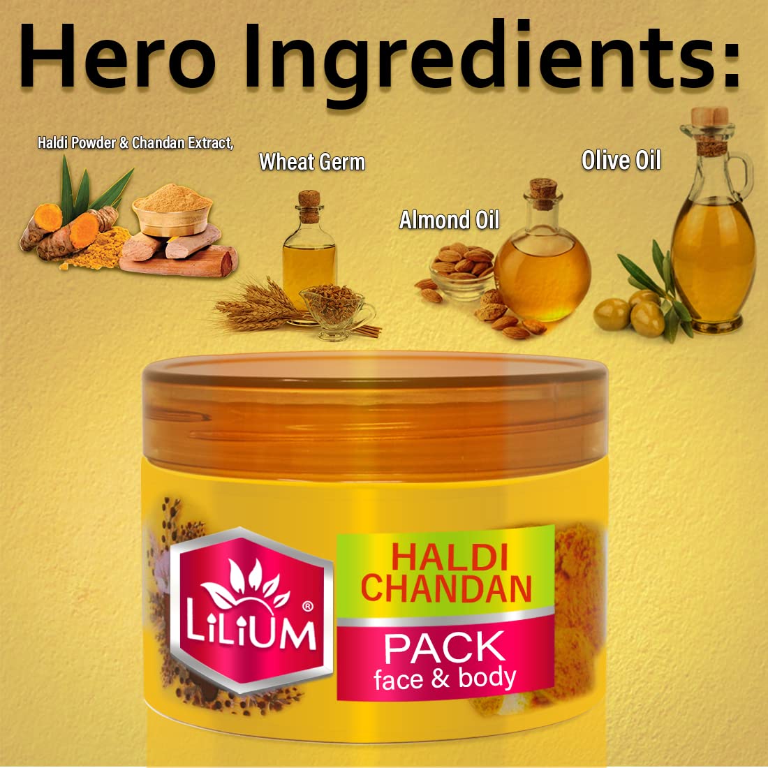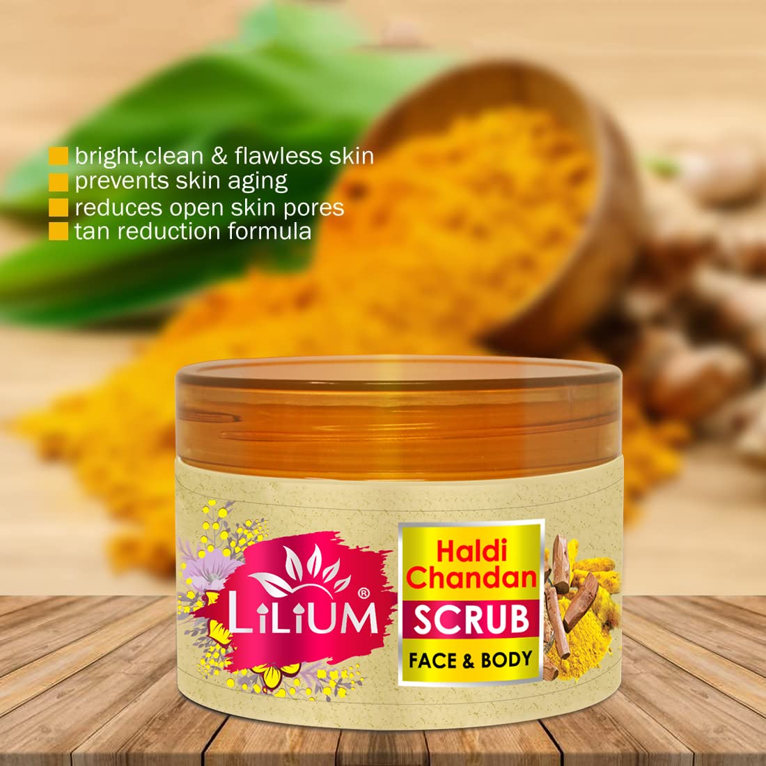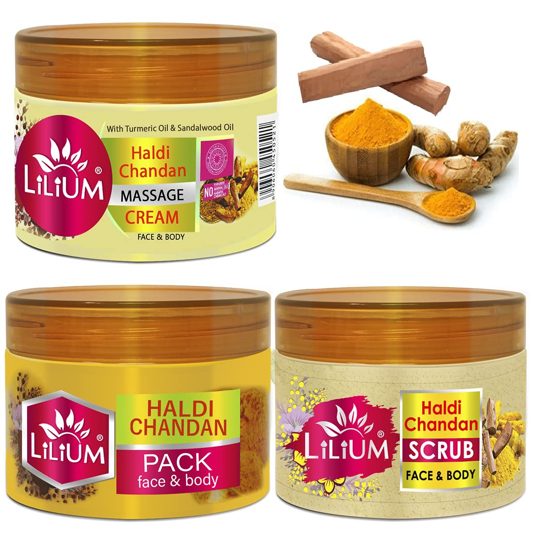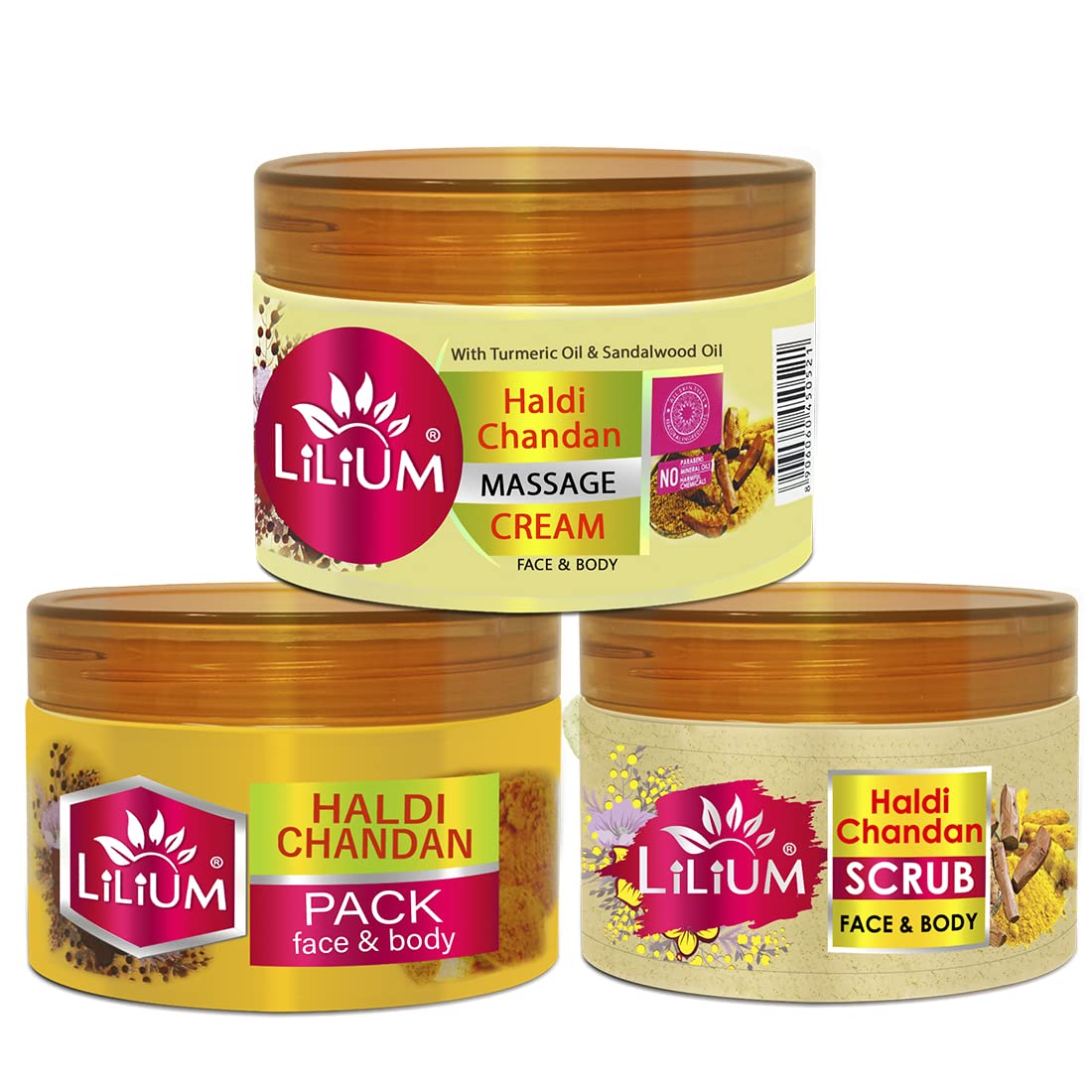 [SCRUB]:- Lilium Haldi Chandan facial scrub is mild and pH-balanced to gently deep cleanse your pores of impurities while keeping your skin moisturized. It contains chandan to keep skin supple and reduce the appearance of wrinkles and fine lines and Pearl Protein helps even out your skin tone. For best results combine with other products from Lilium Haldi Chandan Range.Typically created with smoothing herbal extracts scrub cleanser penetrates pores to clear out dirt lift away pore-clogging dust and excess oil. Makes skin clean smooth and healthy-looking and get fresh and flawless fairer skin. [PACK]:- Haldi Chandan Pack suitable for at skin types This face pack removes the impurities of the skin and cleans clogged pores. It nourishes tightens and revitalizes the facial skin giving you flawless fairer skin. [MASSAGE CREAM]:- Haldi Chandan massage cream maintain the fairness glow and shine of the skin. It gives a natural lustre and youthful radiance to the skin. The use of skin care dates back to ancient times Ancient a ayurvedic scriptures claims that haldi imparts radiance to the skin and even has anti-ageing powers. It will help your skin breathe and look best.