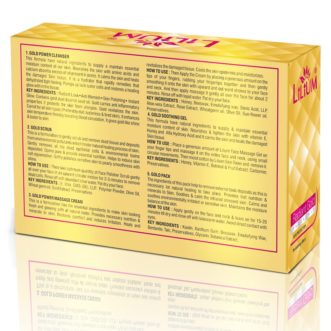 Package Contains : Gold Cleanser Gold Scrub Gold Cream Gold Gel Gold Mask