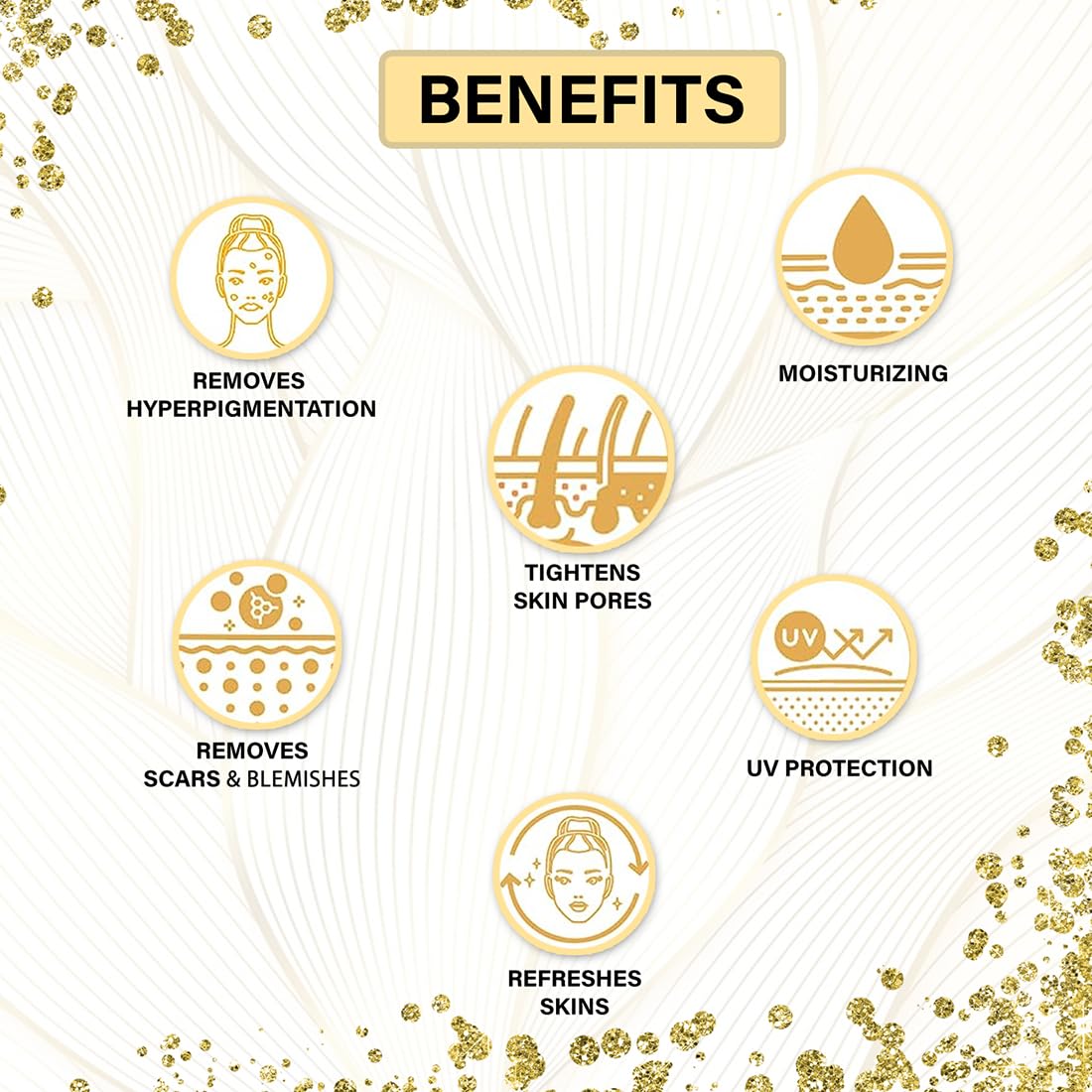 [FACE PACK] Gold Face Pack is has regenerative and moisturizing properties that improve the skin texture boost the skin renewal and leave it hydrated. Fades dark spots and evens out the tone & texture of the skin. Gold infuses into the skin lending it an