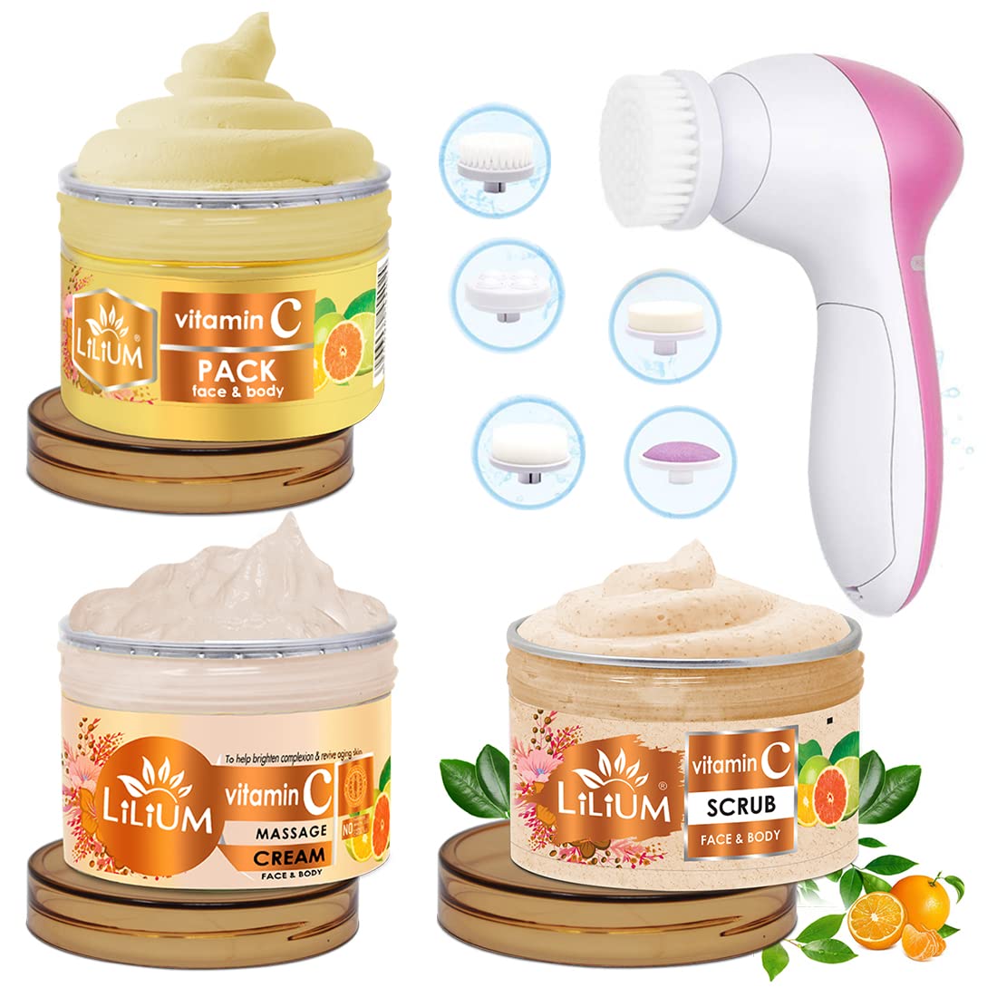 Scrub: Vitamin C facial scrub is mild and pH-balanced to gently deep Cleanse your pores of impurities while keeping your skin moisturized. It contains Orange Extract & Lemon Extract to keep skin supple and reduce the appearance of wrinkles and fine lines and pearl Protein helps even out your skin tone. For best results combine with other Products from Lilium Vitamin C Range. Pack: Vitamin C Pack suitable for at skin types This face pack removes the impurities of the skin and cleans clogged pores. It nourishes tightens and revitalizes the facial skin giving you flawless fairer skin. Massage Cream: Vitamin C massage cream maintain the fairness glow and shine of the skin. It gives a natural lustre and youthful radiance to the skin. The use of orange & lemon in skin care dates back to ancient times Ancient a ayurvedic scriptures claims that orange imparts radiance to the skin and even has anti-ageing powers. It will help your skin breathe and look best. The lustre on your skin will be similar to that of orange. The skin is also revitalized by regular use of the product.