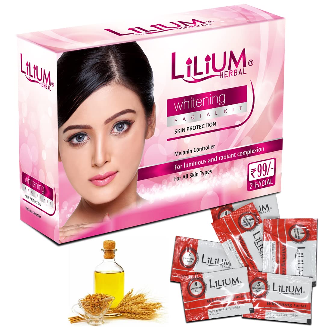 Buy this Product From The House Of Good Choice India on Amazon.in The Lilium Whitening Facial Kit" fortified with Actives is a complete "Do it yourself" Facial Kit that can be used at the comfort of your home. In today’s day and age exposure to Sun Pollution and Impurities in our surroundings leaves our skin dull dark and lifeless! Maintaining good skin health is the top most priority for all of us! Whitening Facial Kit" helps tackle these skin concerns. Enriched with the concoction of Activated with natural ingredients that are fortified with Actives delivers maximum efficacy with skin rejuvenation benefits for a purified balanced and glowing skin! This kit is suitable for skin types.