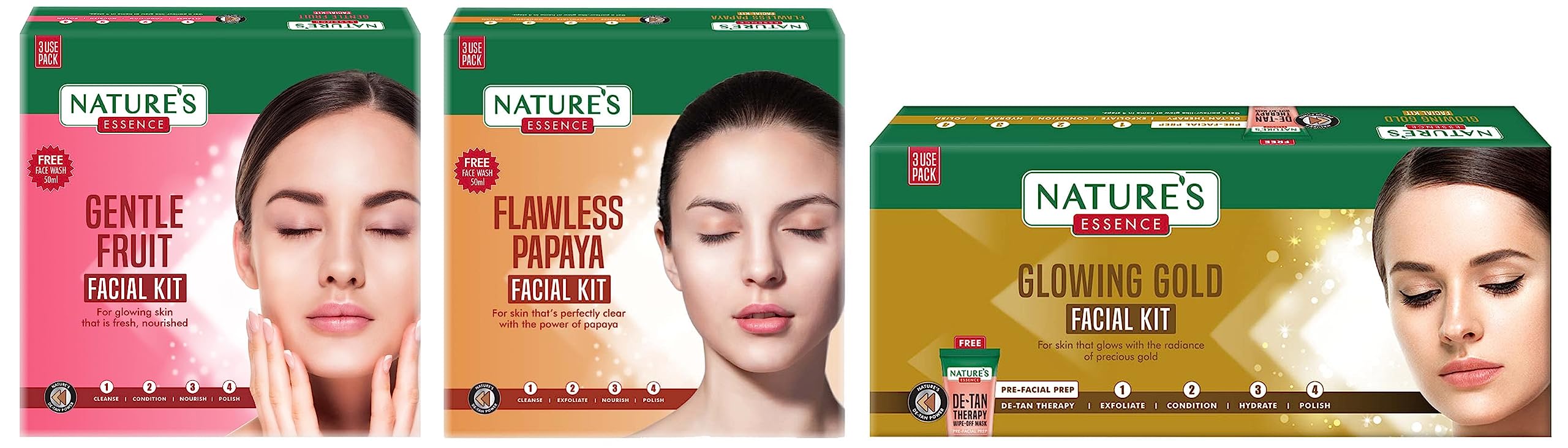 Nature's Essence Glowing Gold Facial Kit 3 Use Multiple 5 count 75 gmGet ready for a parlour like glow at home. Exfoliate condition hydrate and polish your skin from comfort of your home. The facial kit also has a free De-Tan therapy wipe off mask which is essential for pre-facial prep. Get ready to flaunt the radiance of precious gold.Nature's Essence Flawless Papaya Facial Kit 3 Use White 1 count 60 gmGet ready for a parlour like glow at home. Cleanse exfoliate nourish and polish your skin from comfort of your home. The facial kit also has a free De-Tan therapy wipe off mask which is essential for pre-facial prep. Get ready to flaunt the perfectly clear skin with the power of papaya.Nature's Essence Gentle Fruit Facial Kit 3 Use White 1 count 60 gmFruit facial kits gently nourishes your skin and keeps it fresh and radiant. It is infused with saffron which keeps your skin visibly smoother. The firming pack keeps your skin nourished.