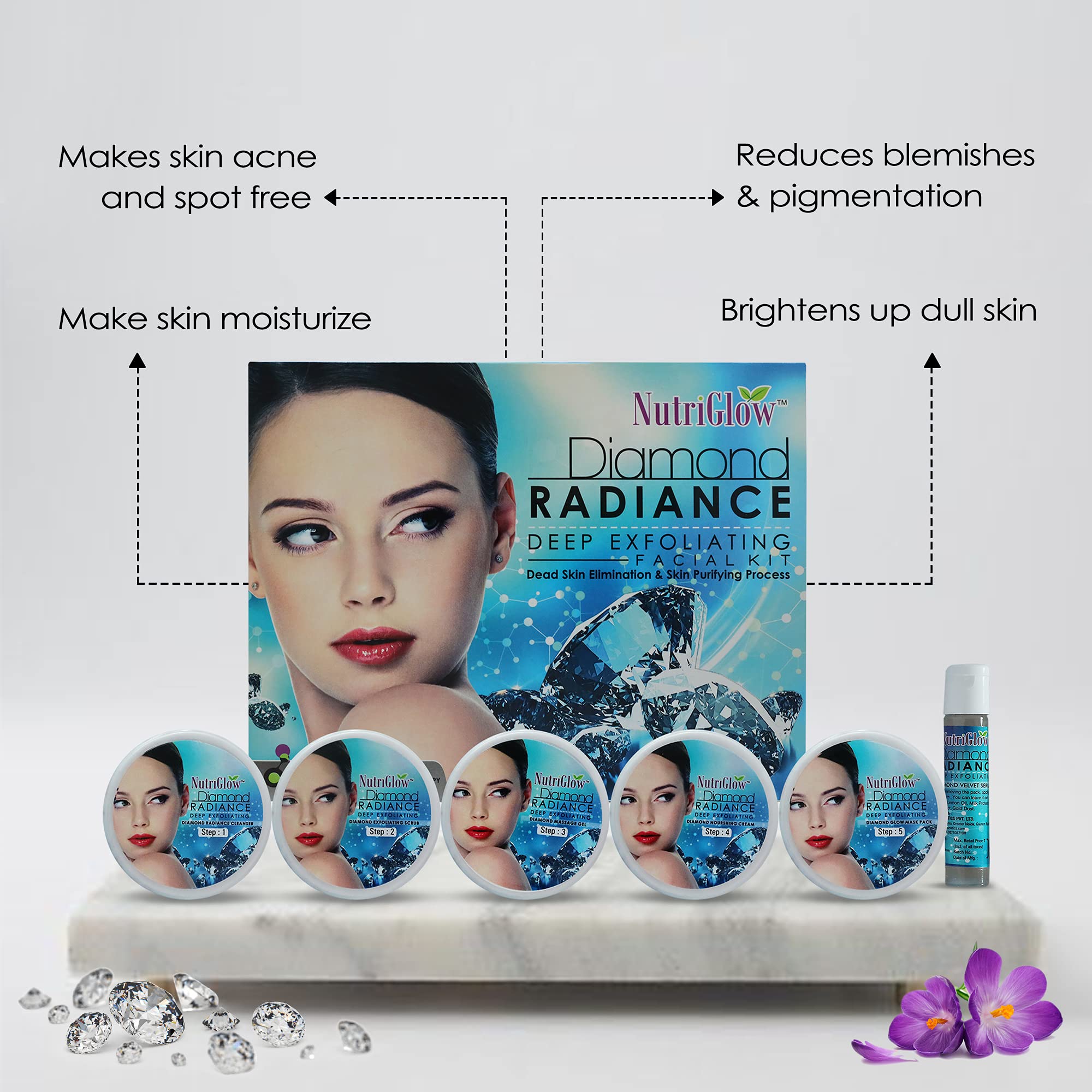 NutriGlow isn't just a brand name. It is truly a commitment to bring out the purest healthiest products and educating every individual on why organic self-care is so important. We strive to live with compassion kindness and empathy to create something radically new through safe & potent formulas. Most importantly we believe in the power of nature to bring tangible results keeping the toxic chemicals aside. Ensuring that no animals are harmed in the making of our products is our main concern. We are glad to inform our valuable customers that all our products have natural raw ingredients and we do not use fillers of any kind. Every Ingredient that we include in our product is there for a particular therapeutic reason. Our products are never tested on animals and don't exploit anyone in making them. We aim towards more sustainable packaging through the use of recycled plastic and responsibly packaging. Today more and more brands are following in our footsteps and we are glad to welcome them aboard. The world needs it. It's time to give your skin the nourishment it deserves! Infused with the goodness of pure and effective ingredients this facial kit gently exfoliates parched skin to reveal smoother cleaner and more radiant skin. So ladies! Head over to flaunt your beautiful skin with this exclusive range of cruelty-free vegan and nature-inspired product that you are sure to love. 1. Get that flawless skin all year round with Diamond Radiance Facial kit 2. Rejuvenate your skin with Diamond Radiance Facial kit 3. Hydrate and add glow to your skin with Diamond Radiance Facial kit 4. Hydrate and protect your skin's natural moisture with Diamond Radiance Facial kit