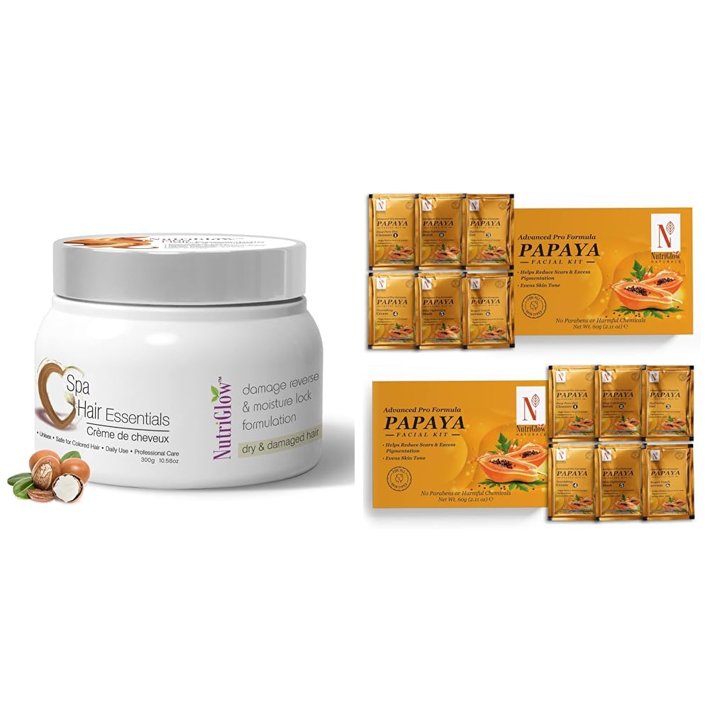 NutriGlow Hair Spa Cream with Damage Reverse & Moisture Lock Formulation for Dry & Damaged Hair - 300g & NATURAL'S Advanced Pro Formula Papaya Facial Kit For Glowing Skin - 10gmx6 Each Pack of 2