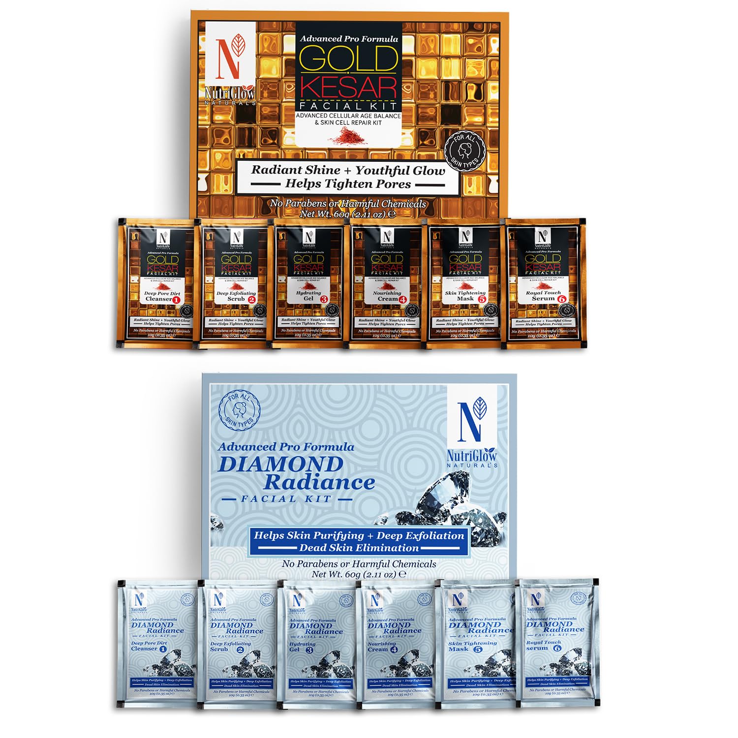 NutriGlow NATURAL'S Advance Pro Formula Gold Kesar & Diamond Radiance Facial Kit For Skin Purifying Deep Exfoliation & Dead Skin Elimination - 60gm Each 2 x 60 g