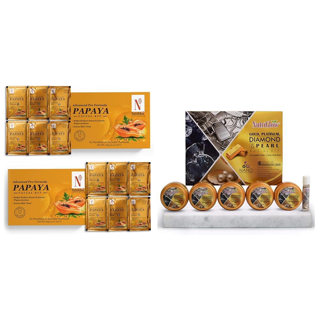 NutriGlow NATURAL'S Advanced Pro Formula Papaya Facial Kit For Glowing Skin - 10gmx6 Each Pack of 2 & Platinum Diamond Gold and Pearl Facial kit 6-Pieces Skin Care Kit For Women 250 gm+10ml