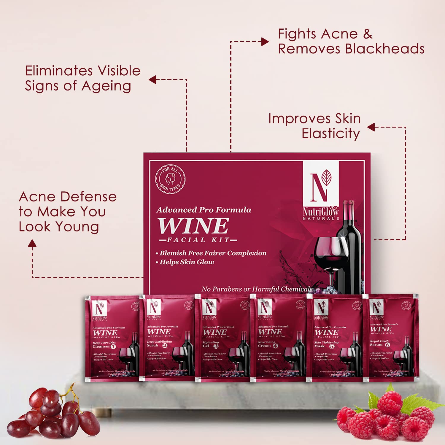 Get the secret to ageless skin with the power-packed antioxidants of red grapes in our Wine Facial Kit. Combined with the Wine Bleach it diminishes signs of aging leaving skin supple and refreshed.