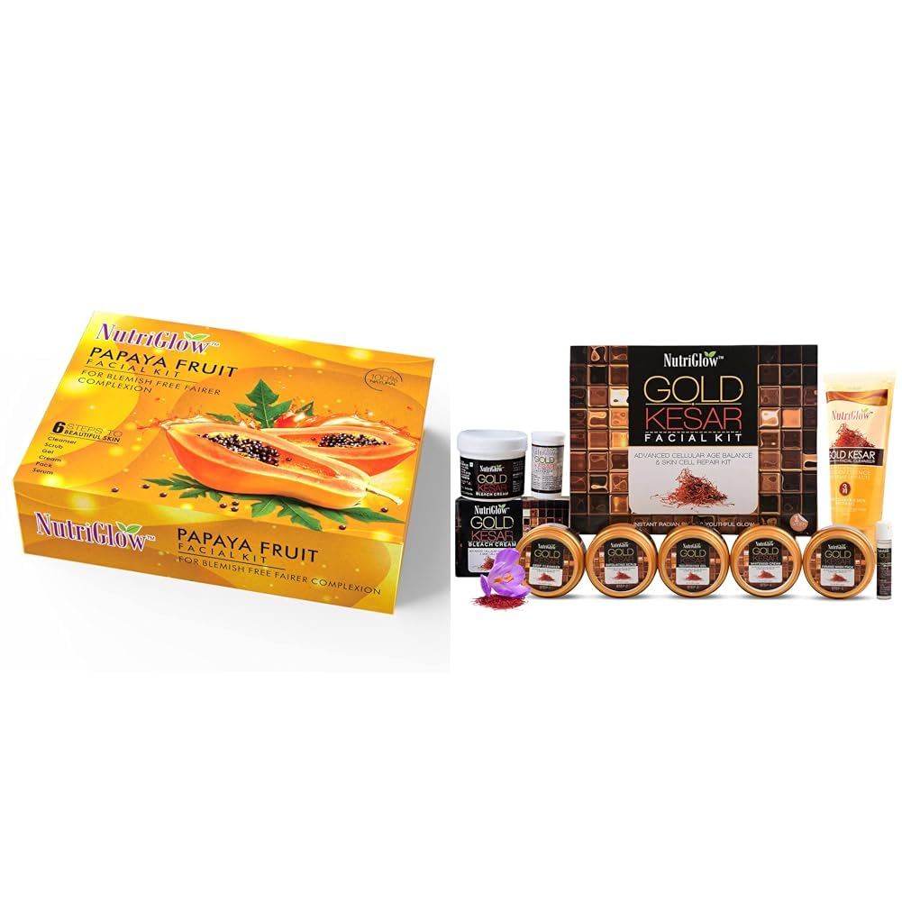 NutriGlow Papaya Fruit Facial Kit for Men Women for Glowing Skin (260 Gram - 10 ml) & Gold Kesar Facial Kit (250gm + 10ml) with Bleach Cream (43gm) & Face Wash (65ml) All Skin Types (Pack Of 3)