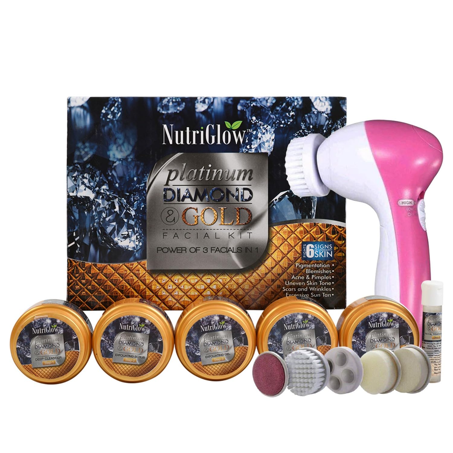 The invigorating energy of diamond and platinum nanoparticles and the healing properties of gold come together in this NutriGlow Platinum Diamond & Gold Facial Kit. Precious metal particles present in these beauty products detoxify the skin paving the way for radiant- and fresh-looking skin. Continuous use of these products leaves your skin nourished with visible changes such as improved complexion less pimples and blemishes reduced wrinkles and lightened skin tone.