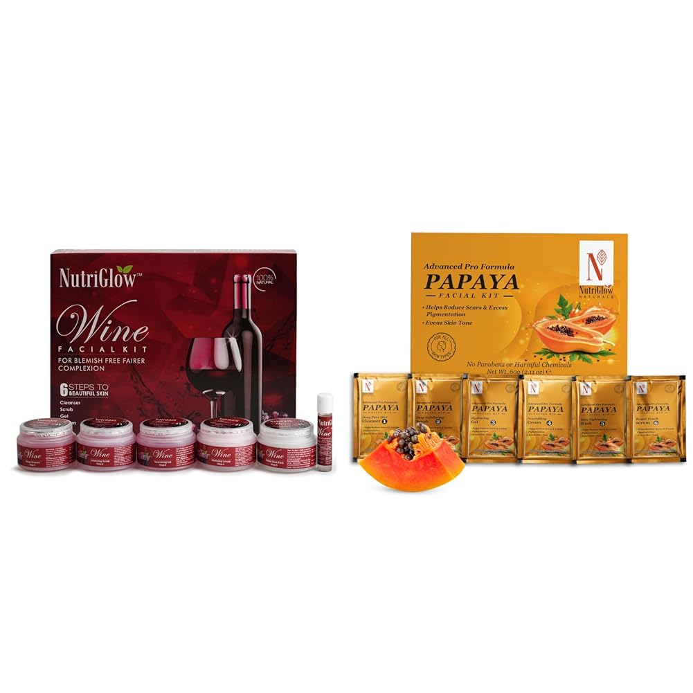 NutriGlow Wine Facial Kit For Radiant Glow All Skin Types- 250g+10ml & NATURAL'S Advanced Pro Formula Papaya Facial Kit for Glowing Skin Cleanup Kit for Even Skin Tone 60gm