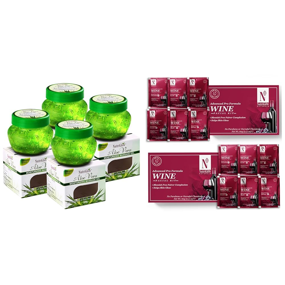 NutriGlowAloe Vera Gel for Face Hair 100 gm Each Pack of 4NATURAL'S Advanced Pro Formula Wine Facial Kit for Blemish Free Fairer Complexion & Helps Skin Glow 10gm x 6 Each Pack of 2